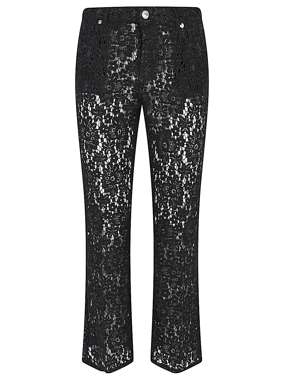 자수 패턴, 플레어 다리, 2 개의 앞 주머니, 2 개의 뒷 주머니 및 지퍼 및 버튼 폐쇄가있는 바지.