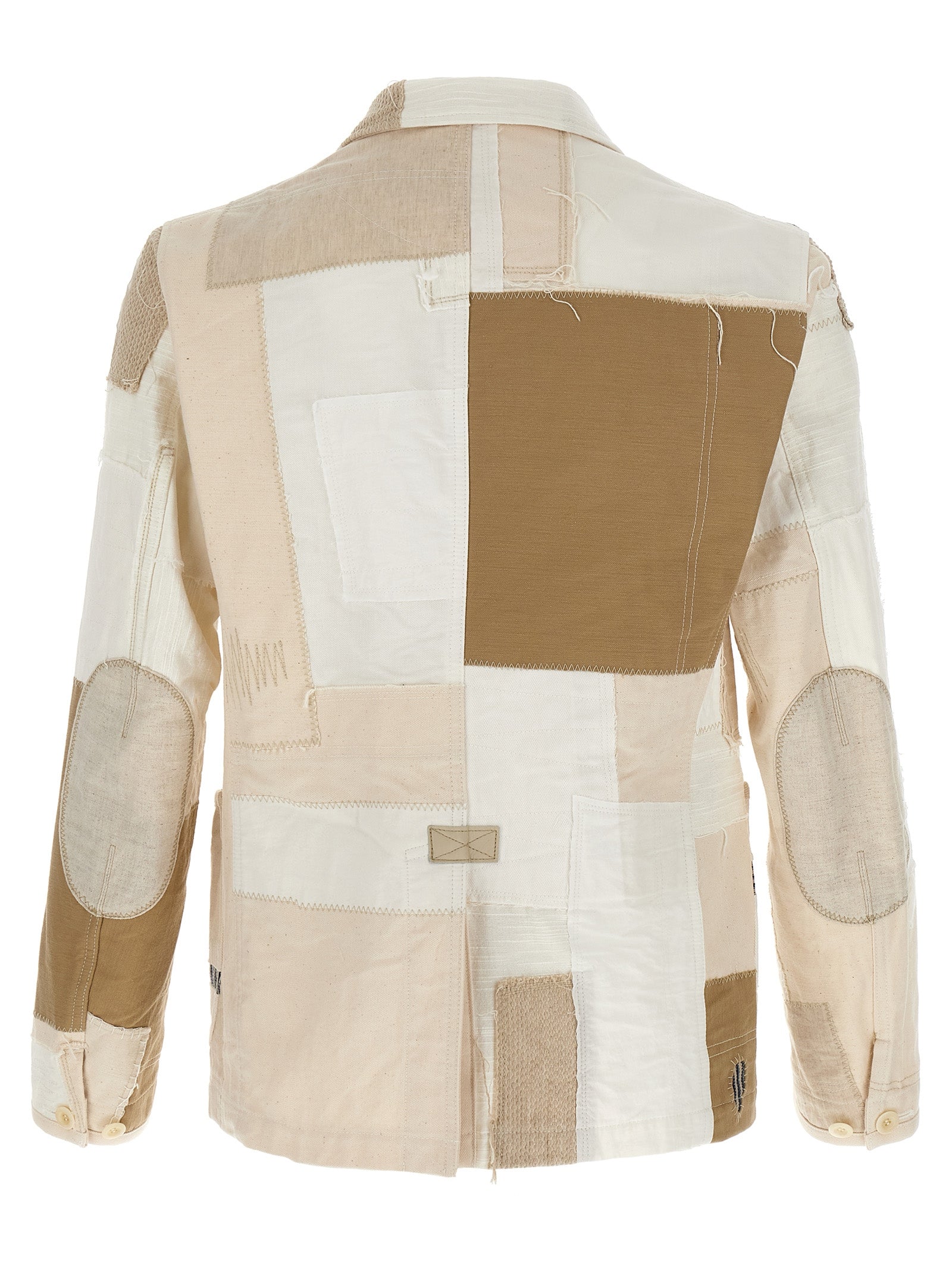 면화 및 린넨의 블레이저는 패치 워크 세부 사항, 전면 버튼 폐쇄, 가죽 주머니, 패치 포켓, 긴 소매, 백 스플릿이있는 패치 워크 세부 사항, 불량한 단일 가슴 해체 모델과 혼합됩니다.