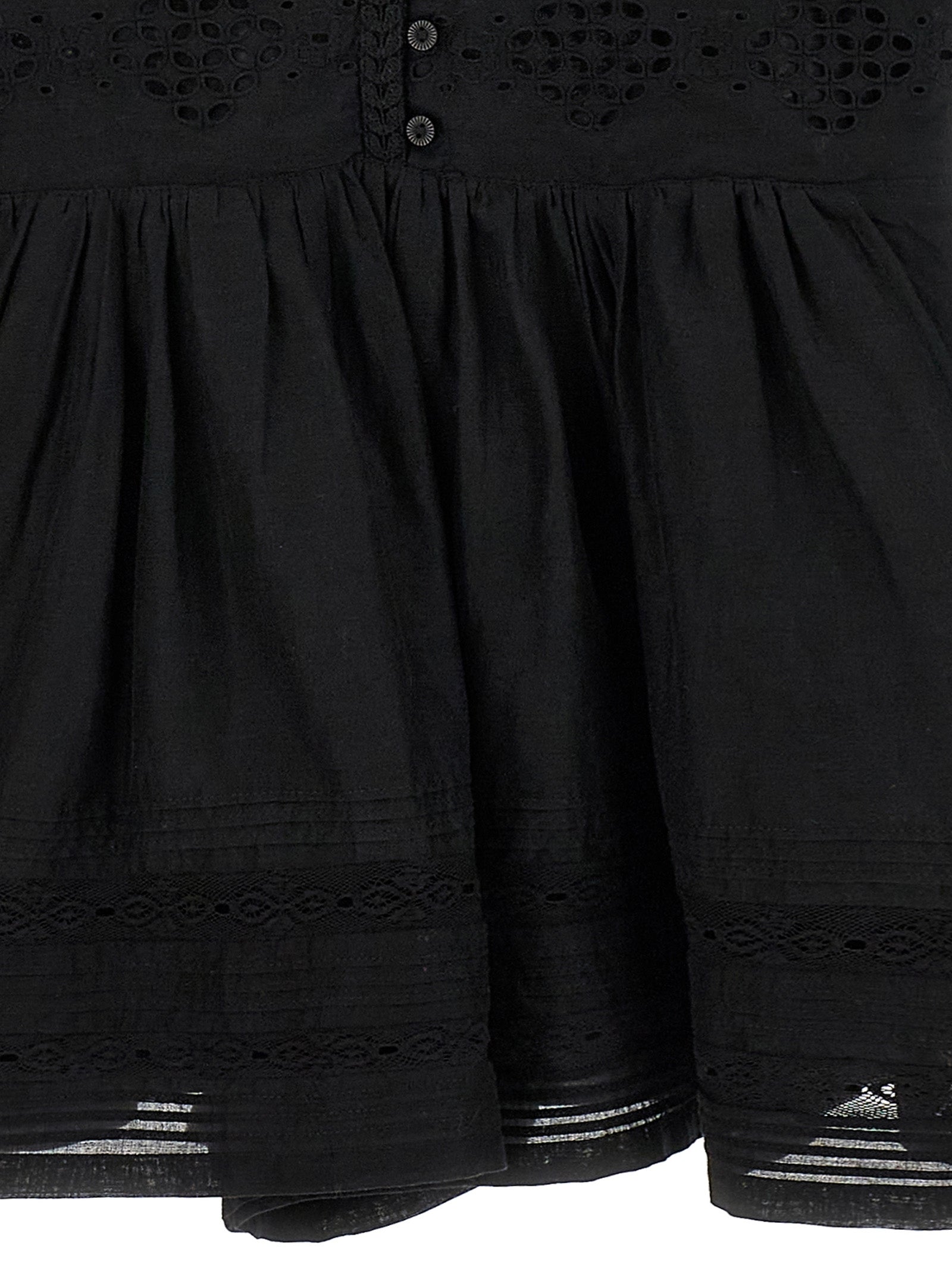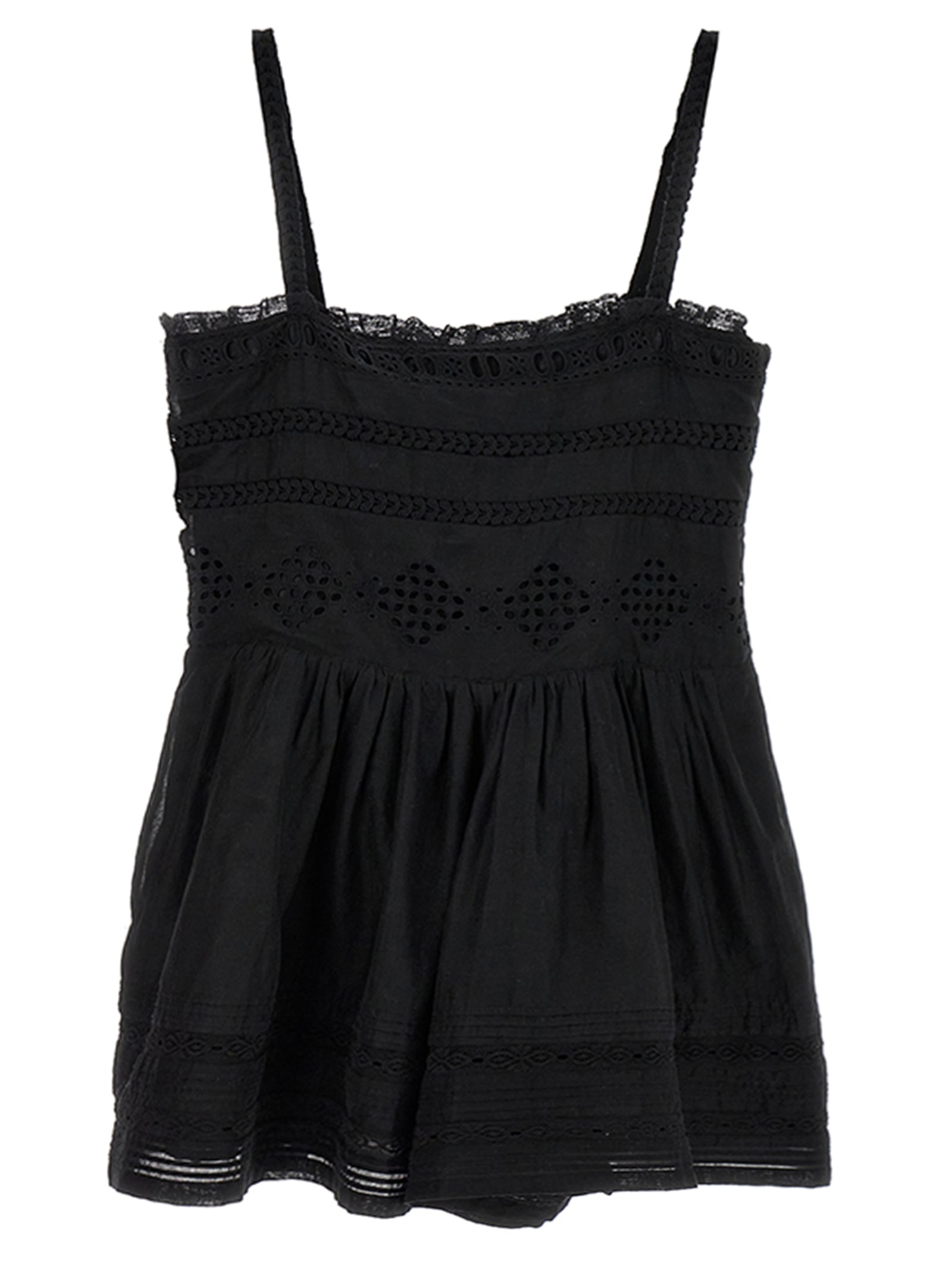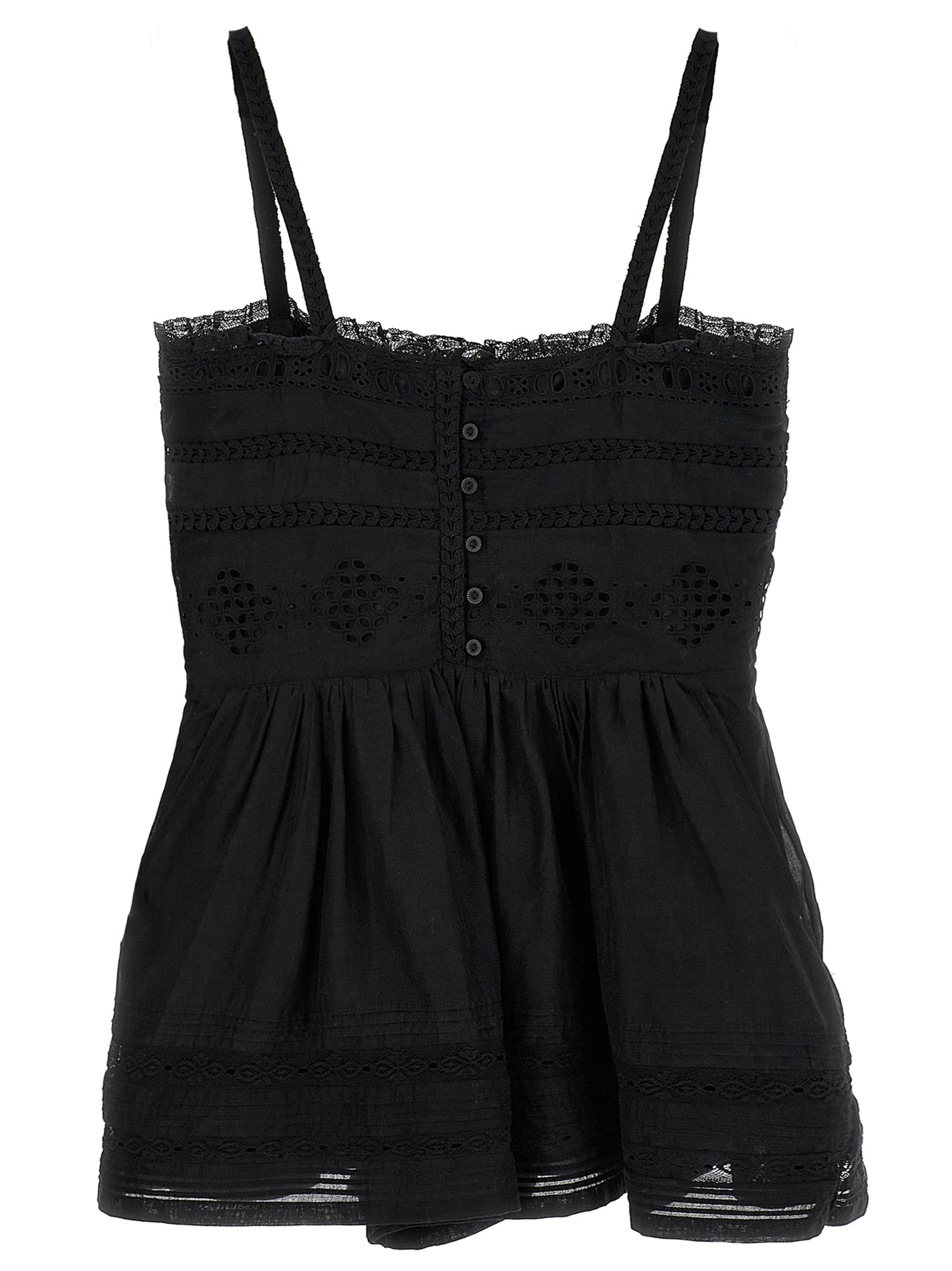 천공 된 면화 voile, 천공 된 상 알로 레이스 세부 사항, 주름 및 컬, 얇은 레이스 스트랩이있는 민소매, 전면 버튼 클로저, 포켓, 정사각형 네크 라인의 '딜런'점프 수트.