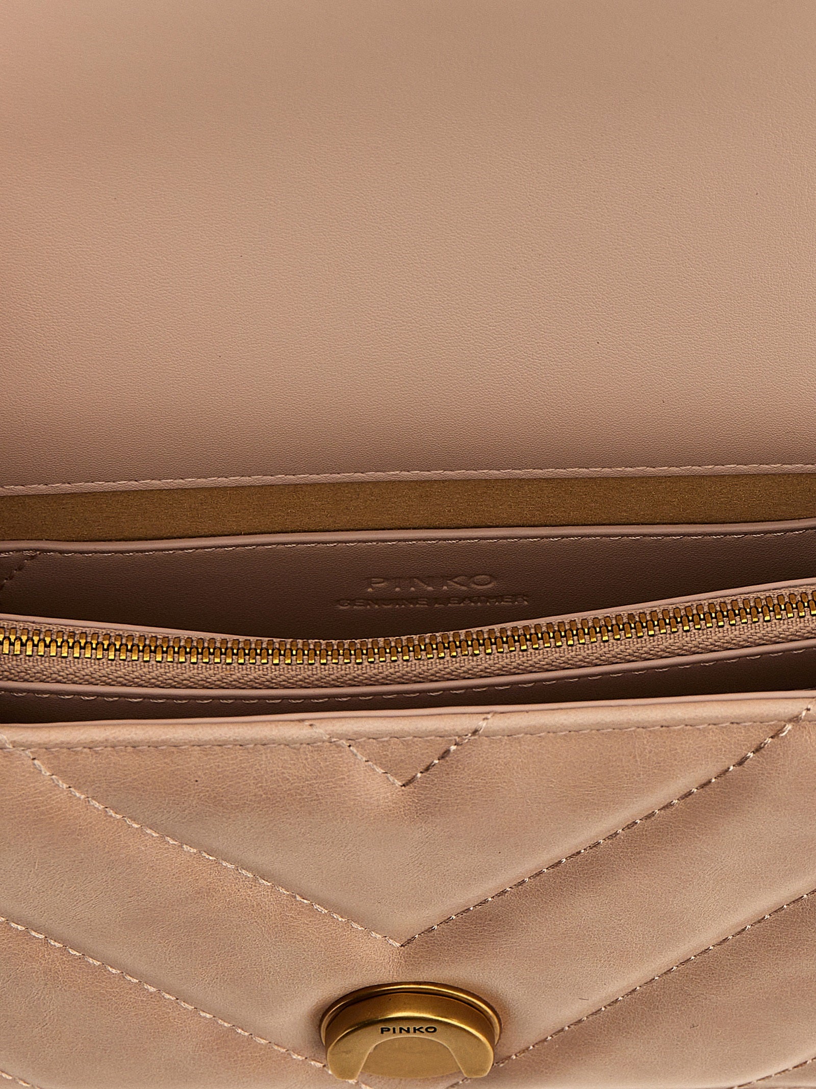 'Love One Mini'쉐브론 퀼트 가죽 크로스 바디 백, 자기 플랩 클로저, 전면 로고 패치, 체인 및 가죽 어깨 끈.