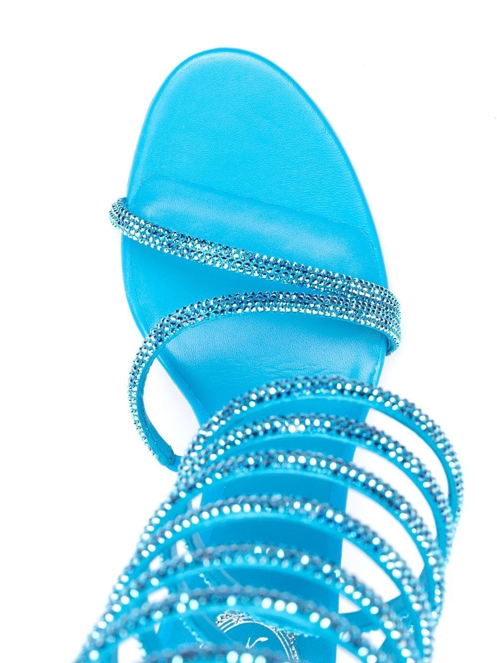 René Caovilla의 Rene 105mm 새틴 샌들 파란색, 송아지 가죽, 새틴 마감, 크리스탈 장식, 셀프 넥타이 고정, 랩 어라운드 스타일, 브랜드 가죽 삽입 및 높은 스틸레토 힐을 특징으로합니다.
