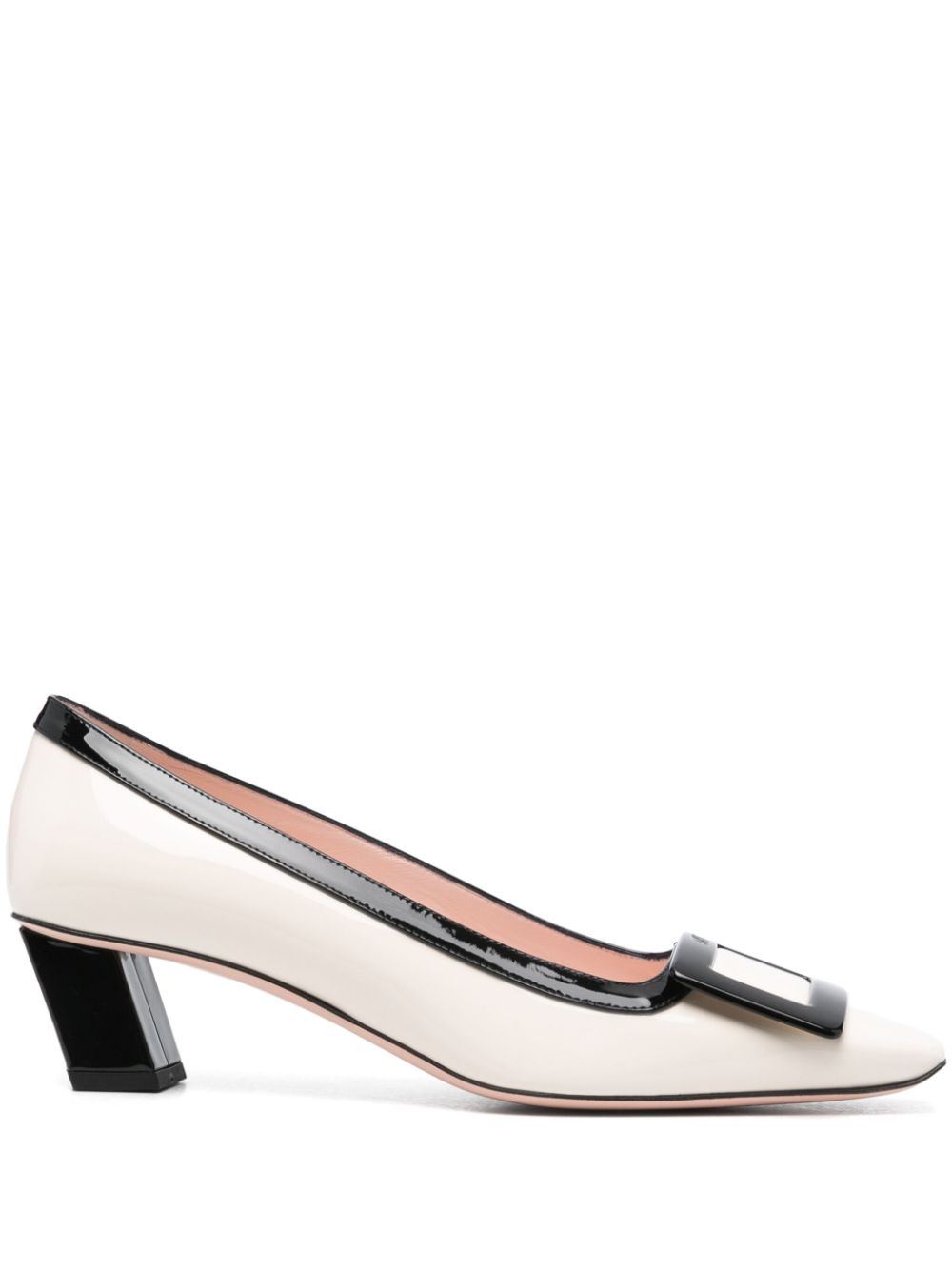 white calf leather patent finish slip-on style 45mm low heel contrasting trim decorative logo-engraved buckle detail square toe branded leather insole leather outsole
