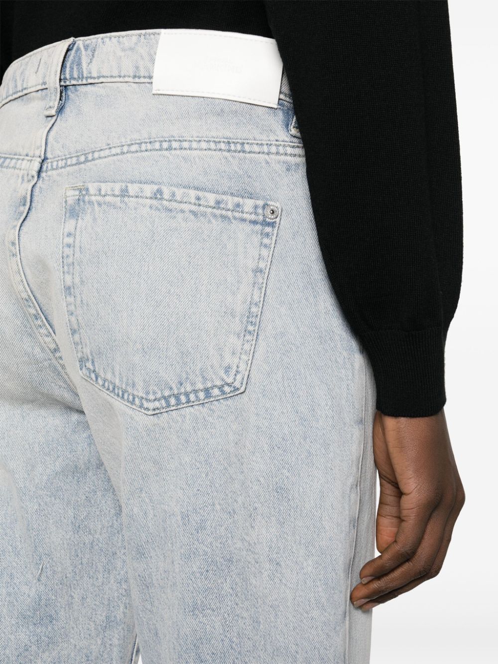 허벅지에 파란색 면세 된 데님 휘 스케팅 효과 고민하는 효과 로고 강화 된 실버 톤 하드웨어 로고 패치는 리어 지퍼 플라이 파티 고정 전면 버튼 고정 벨트 루프 미드 사이드 자르기 다리 클래식 포켓 생일 컷 밑바닥이 없습니다.
