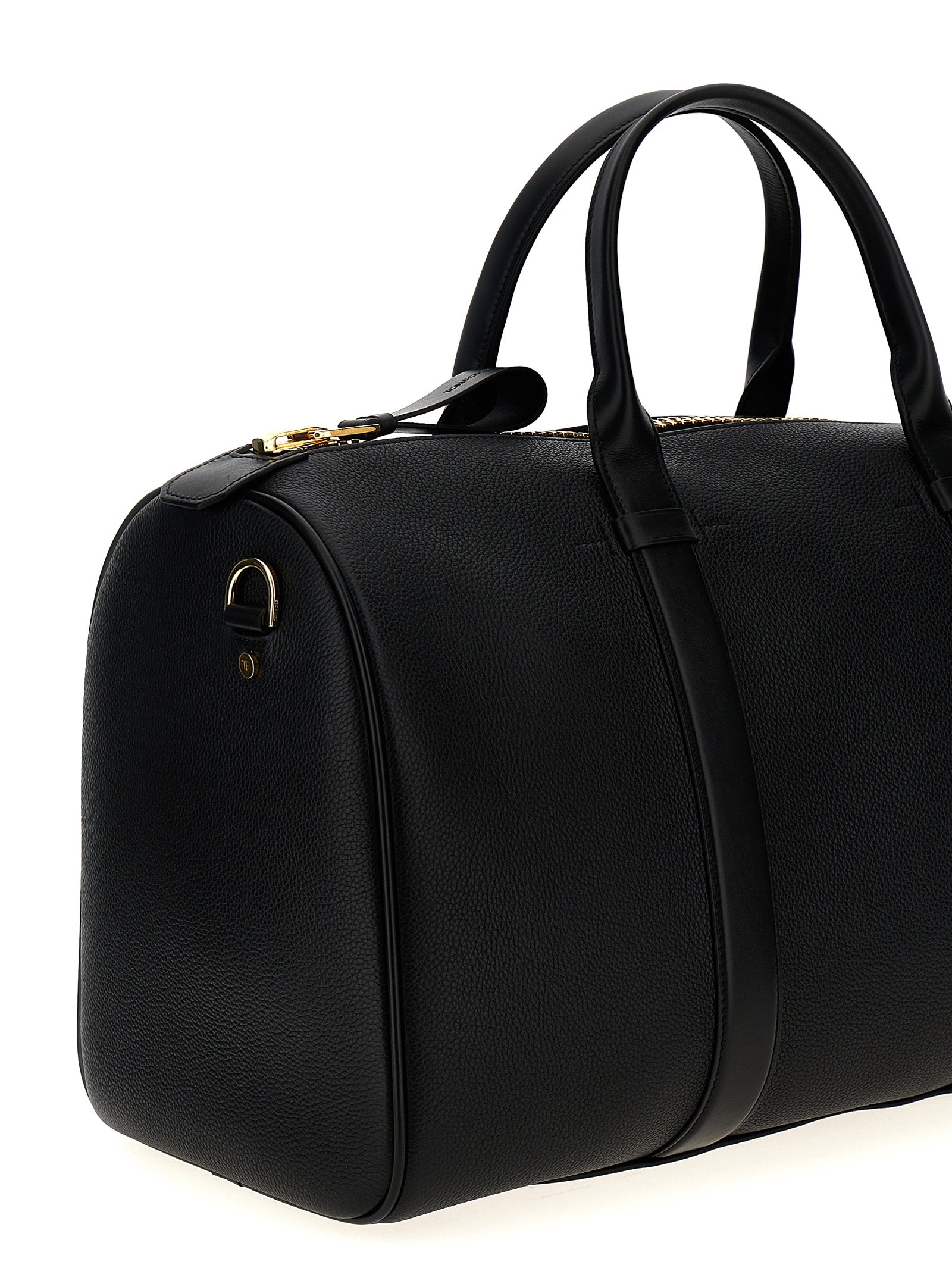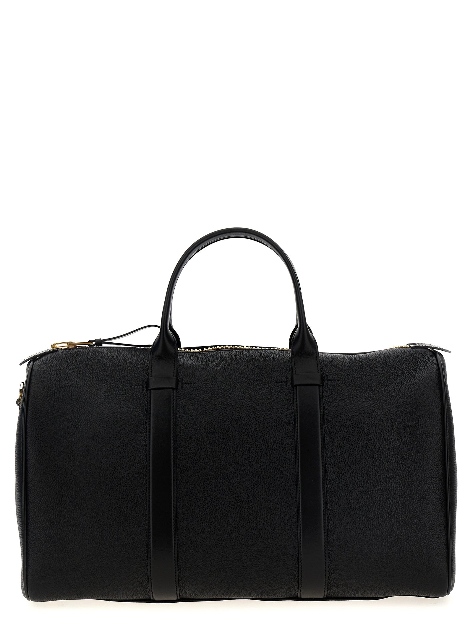 지퍼 클로저, 이중 손잡이, 조절 가능 및 탈착식 어깨 끈이있는 그린 가죽 여행 가방.