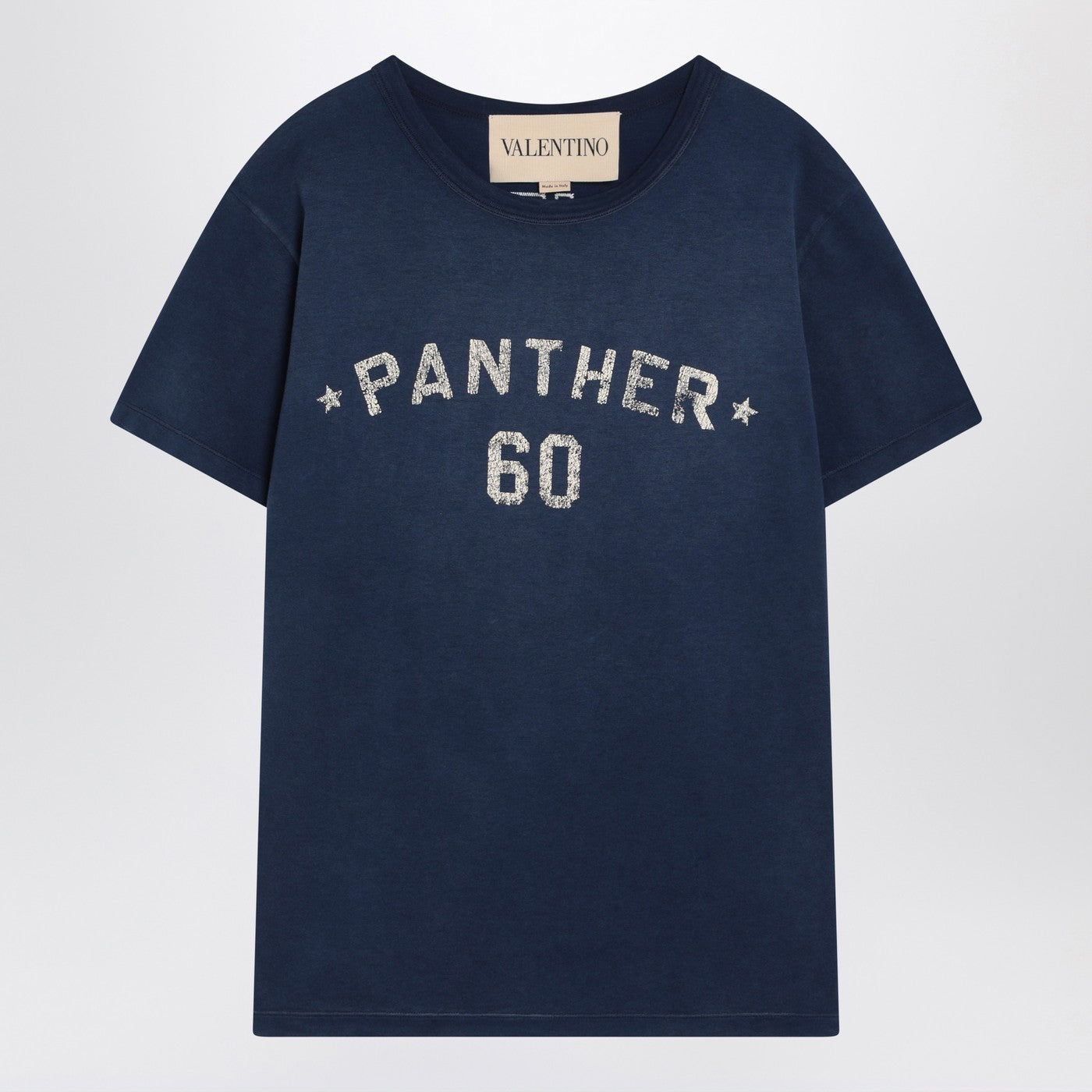 Blue Vintage Effect Valentino의 Cotton T-Shirt, 짧은 소매, 리브 크루 목, 전면 프린트 및 대조적 인 Chez Valentino 자수가 특징입니다.