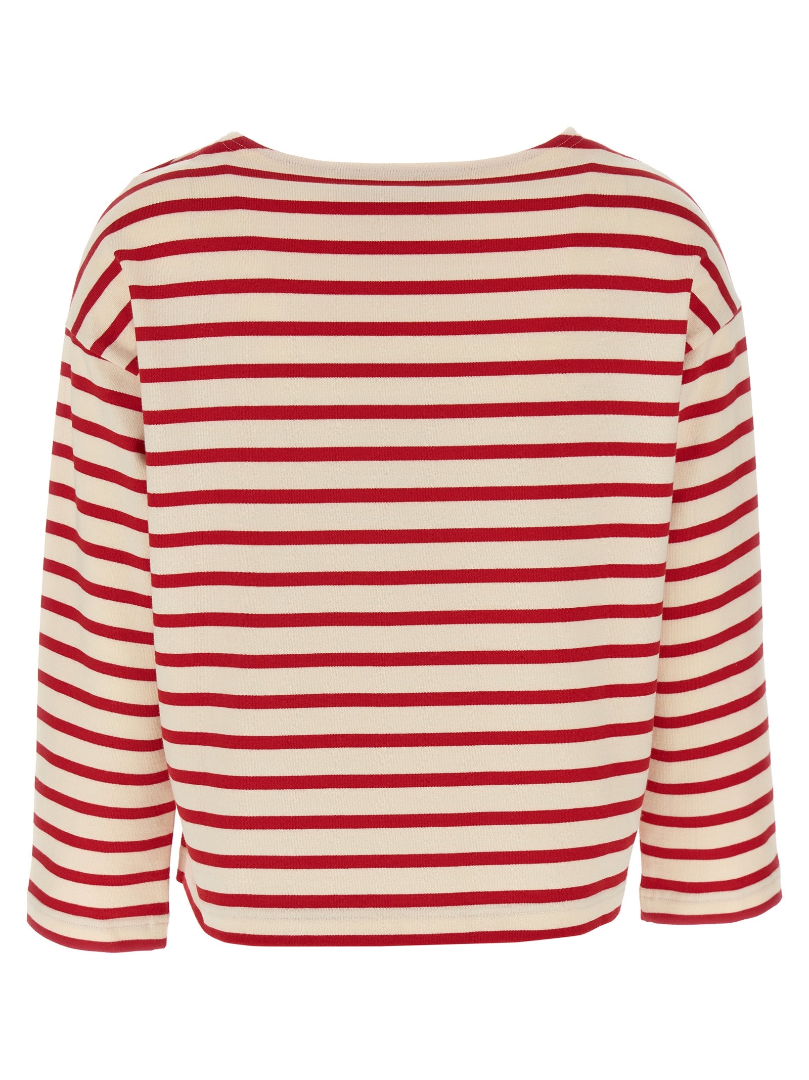 전면 'Chez Valentino'프린트, 보트 넥, 어깨가 떨어진 긴 소매, 측면 스플릿이있는 줄무늬 무거운 면화 저지 티셔츠.