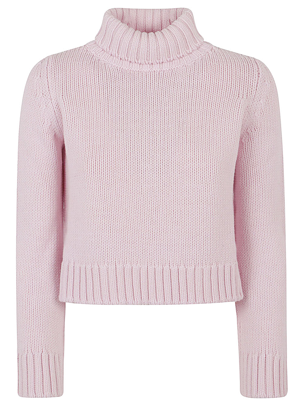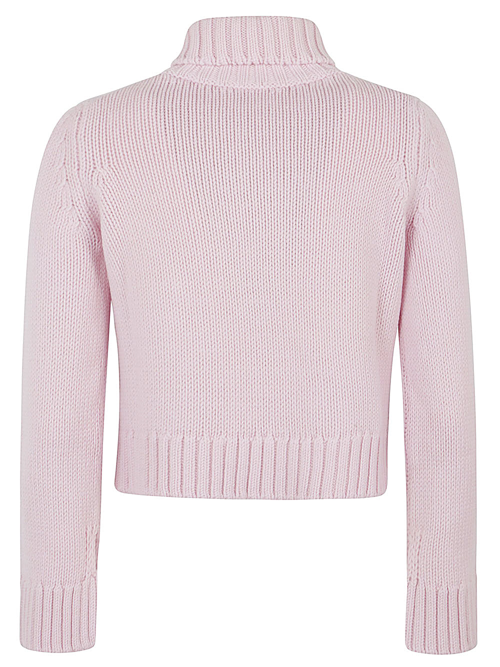 Pink colour, solid colour, made entirely of wool, high collar with knitted design, long cuff sleeves, straight hem.