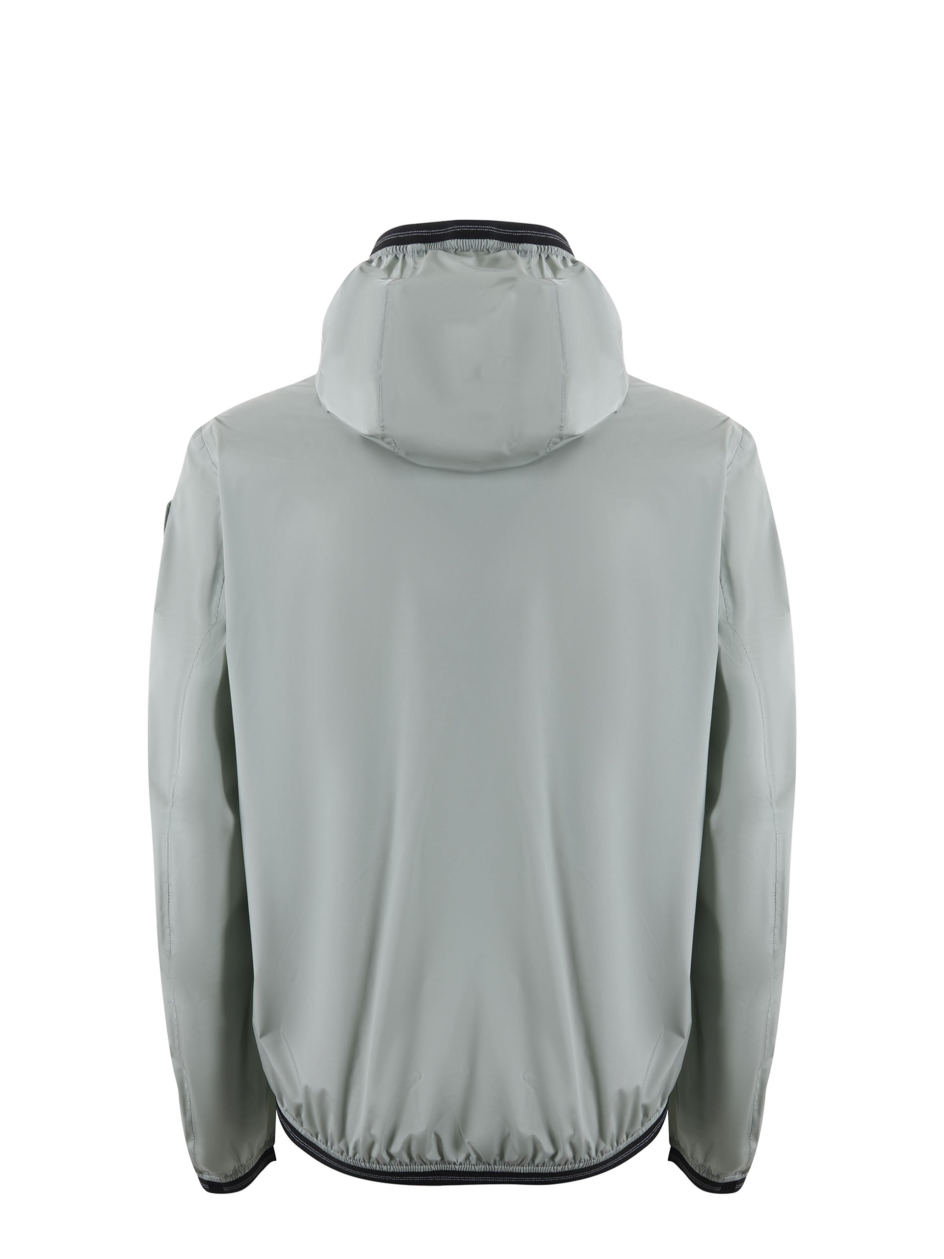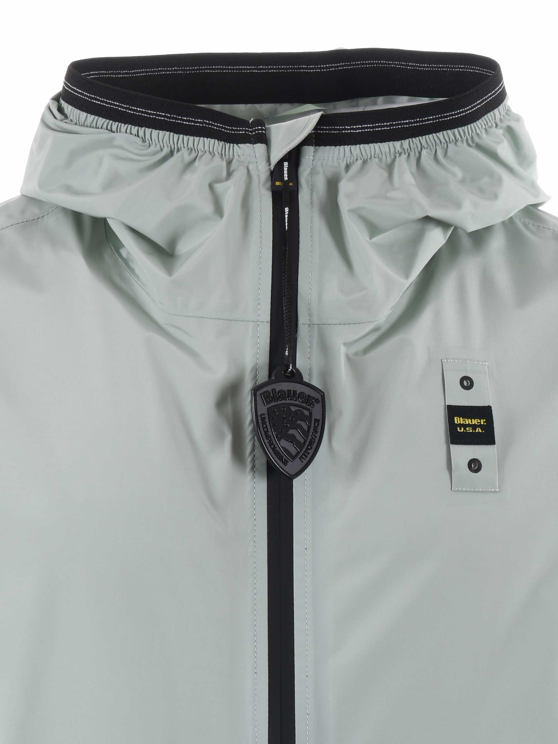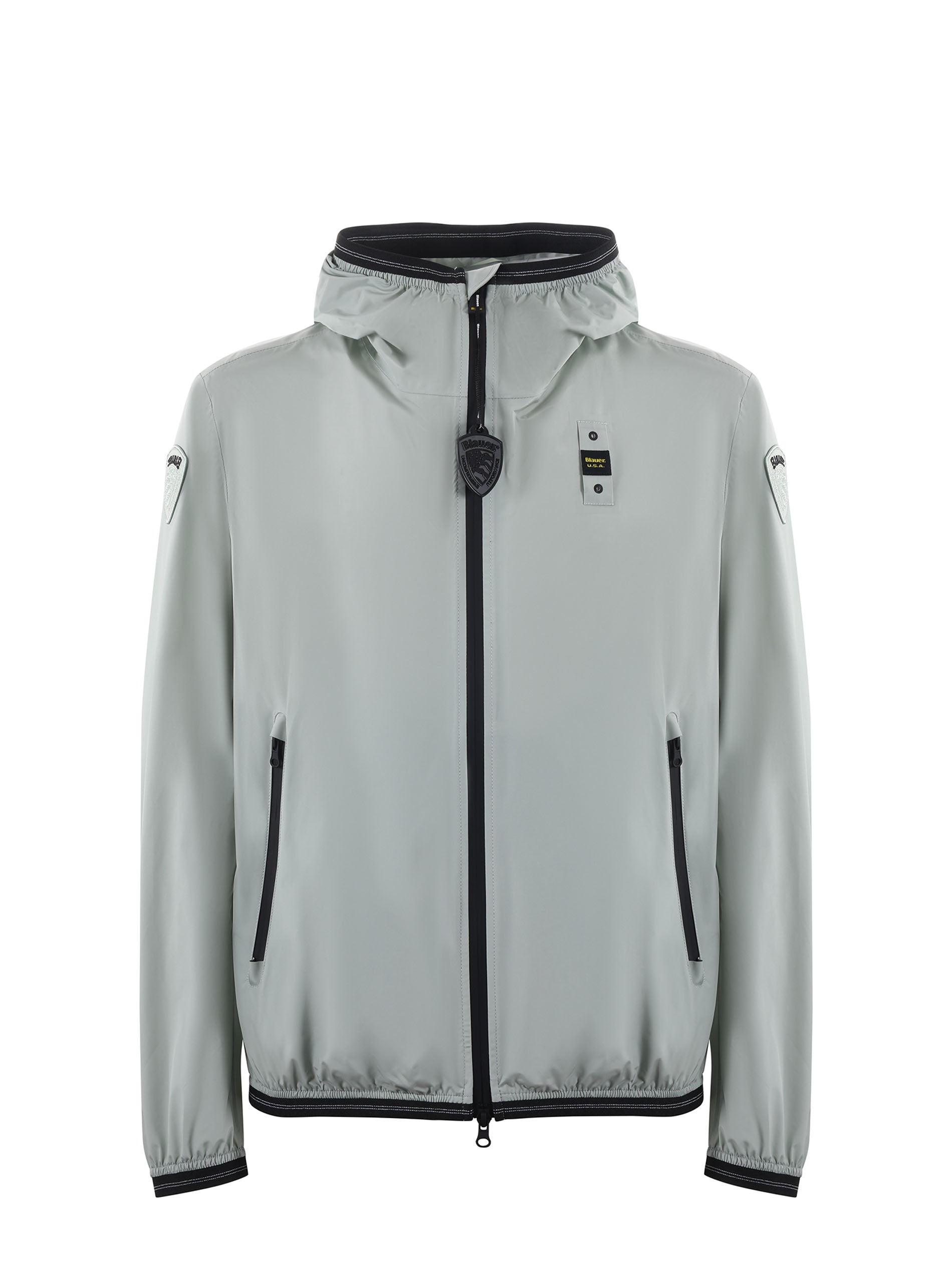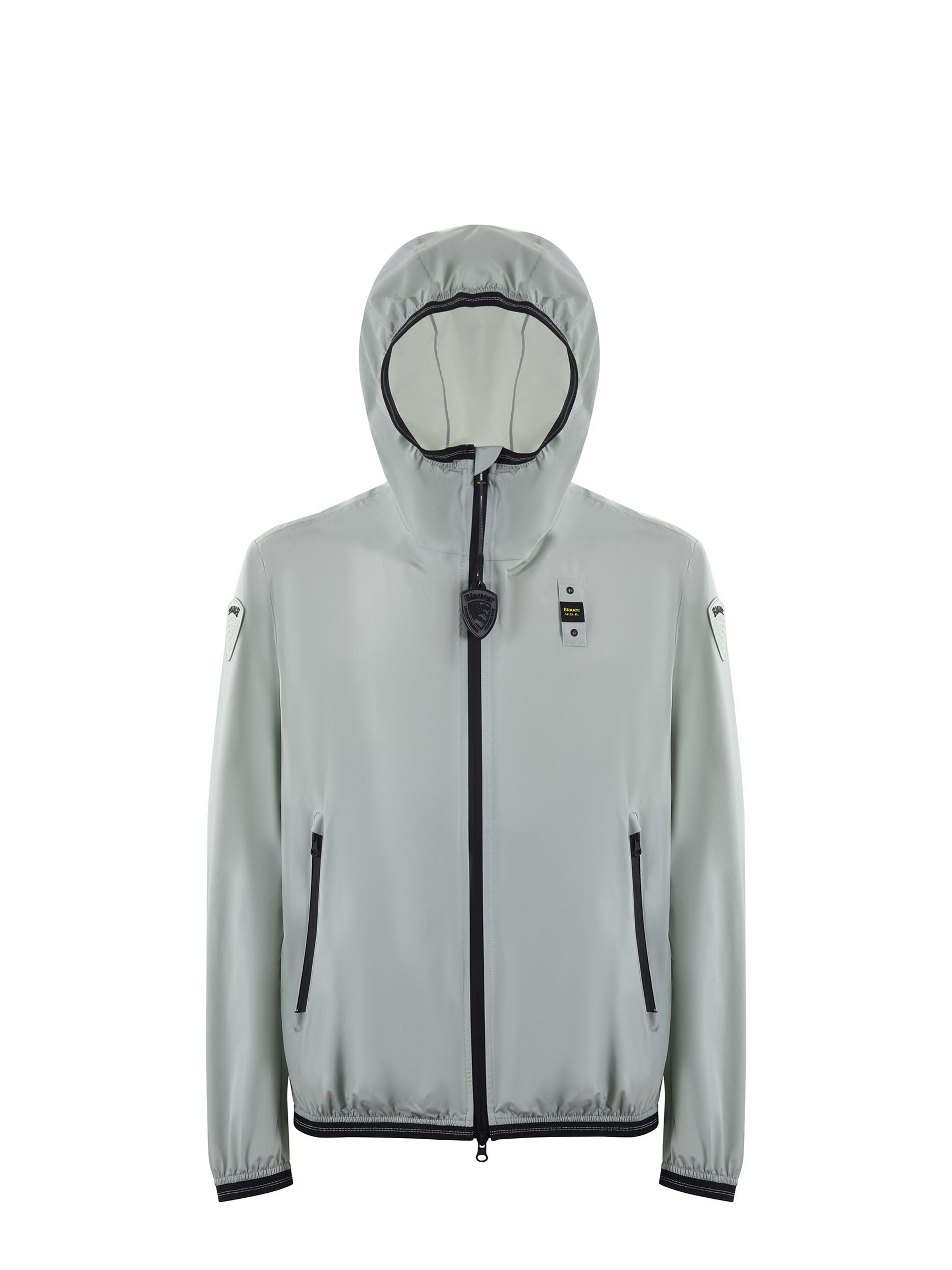 Blauer -jas in stretch nylon. Elastische profielen. Kap met elastische rand. Zakken met zip. Binnenzak. Elastische manchetten en bodem. Dubbele schuifregelaar Zip Sluiting. Onbevelsd. Grootte in foto M 95% polyamide, 5% elastaan