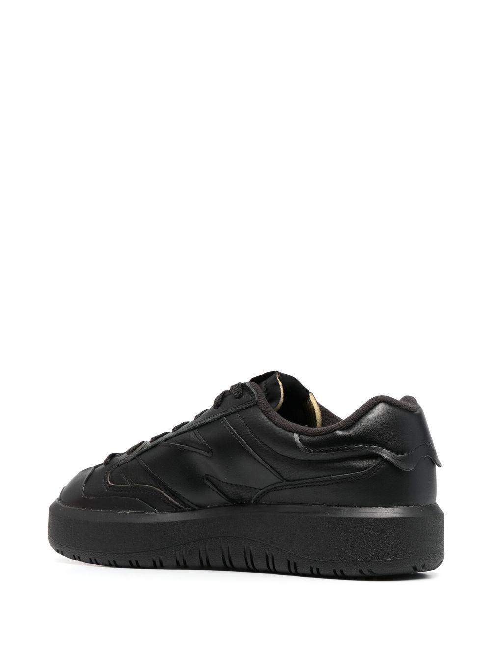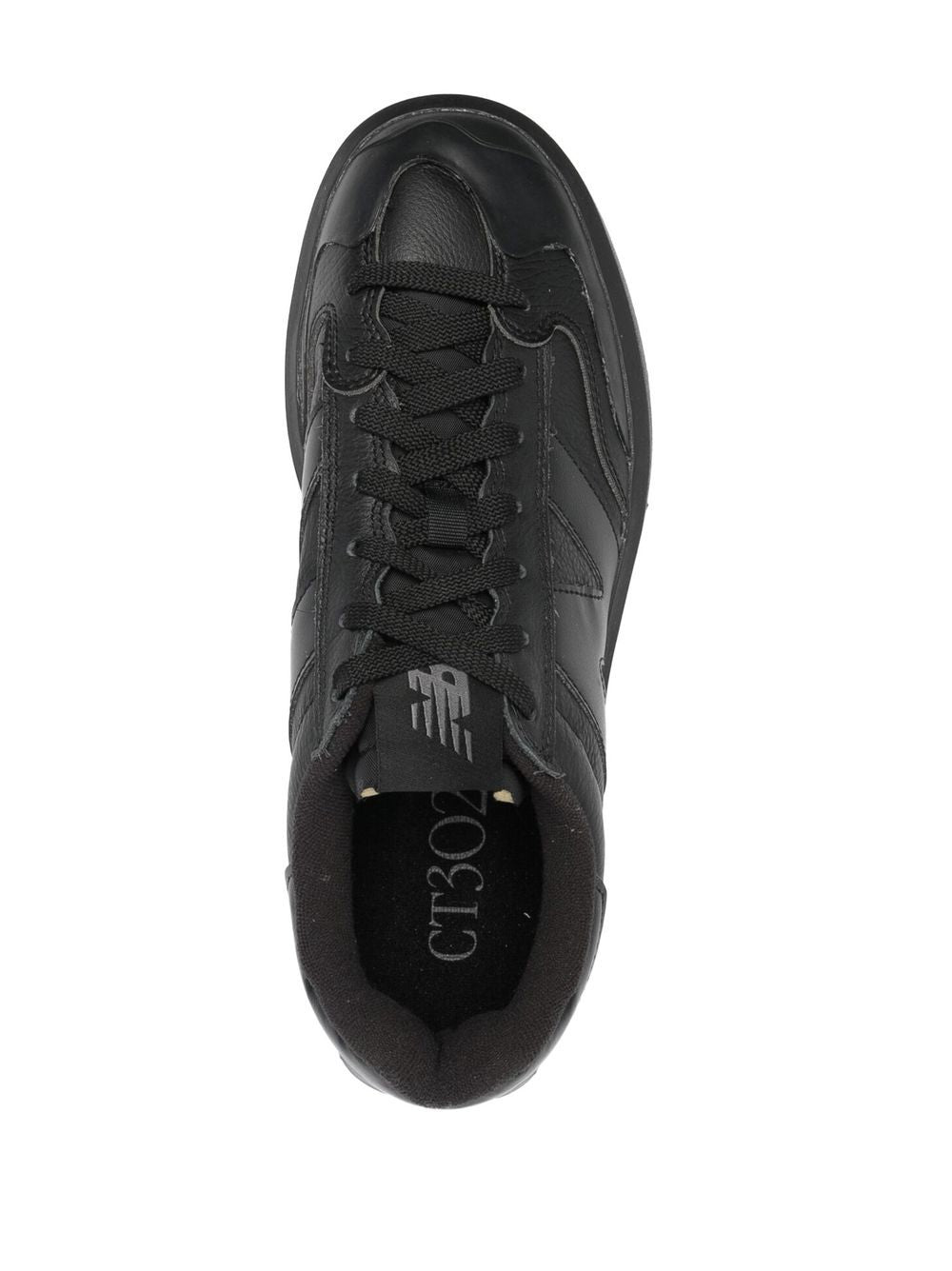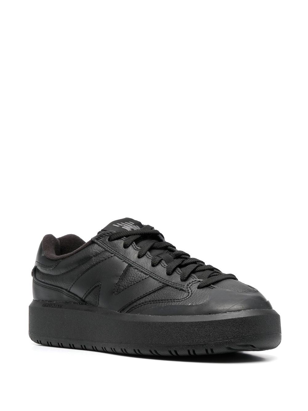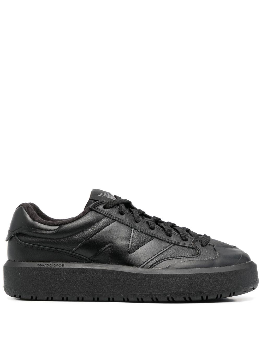 Veter-up low-top sneakers van New Balance met zwart, kuitleer, merkbelang, logo-patch bij de tong, ronde teen, veterbeperking vooraan en platte rubberen zool. CT302LB