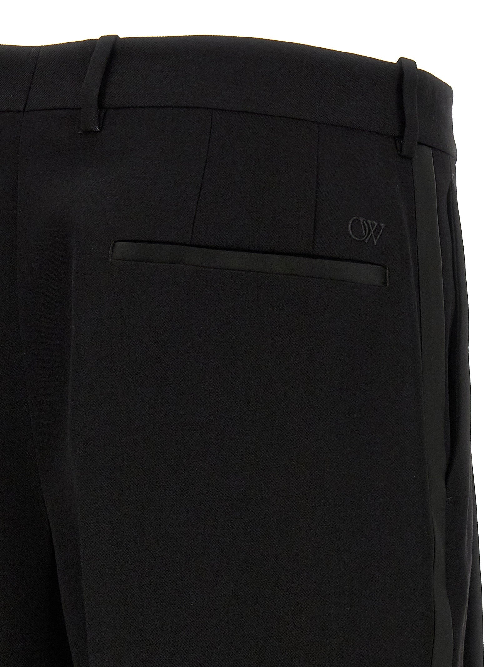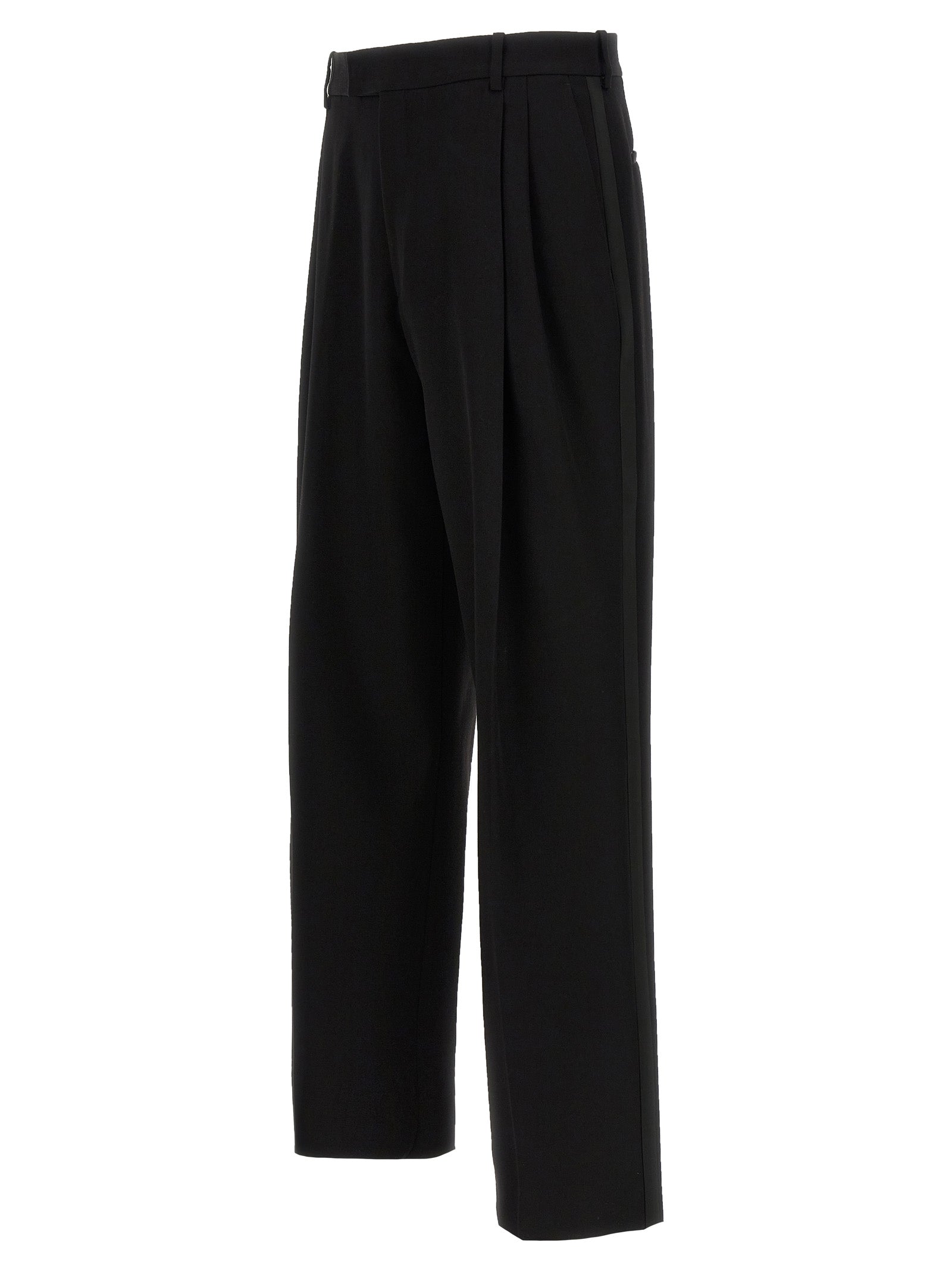 OW EMB Drywo Smoking 'wollen broek met zijkant satijnen banden, haak- en knoop -ritssluiting, zakken, pin -plooien en centrale vouw.