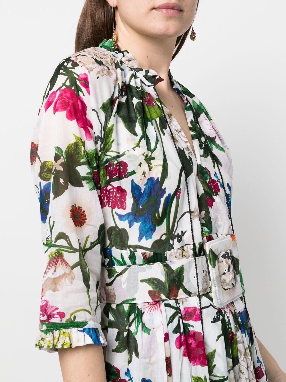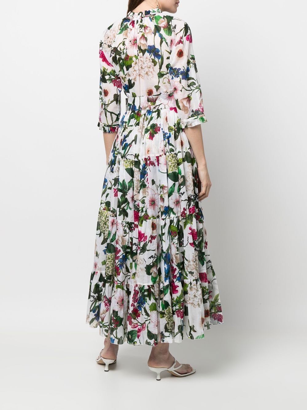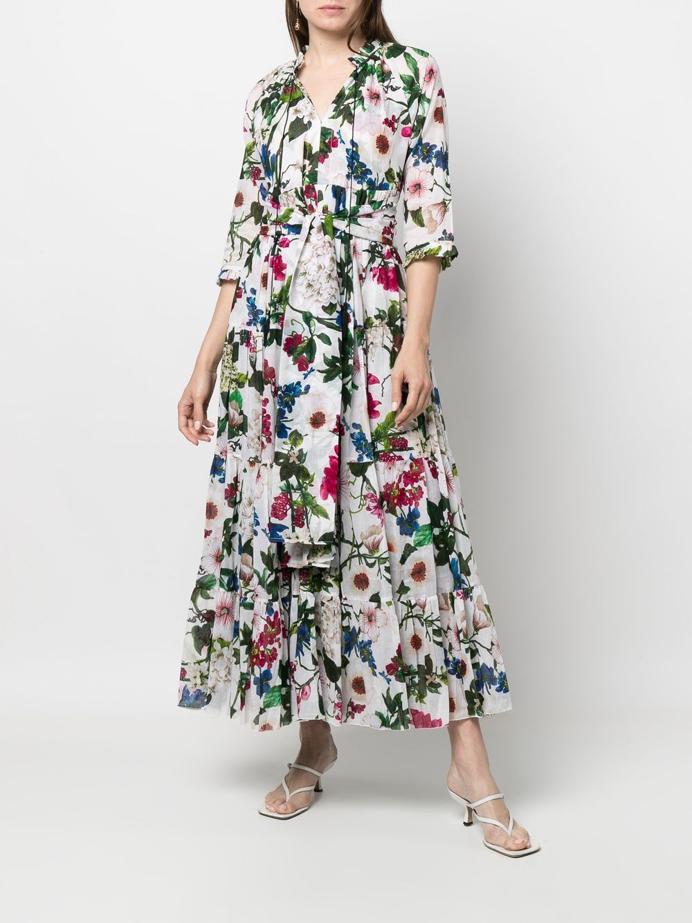 Bloemprint riem maxi-jurk van Samantha Sung met wolkenwit, multicolour, katoen, all-over bloemenprint, driekwart lengtegaten, taille van riem, v-hals, maxi rok en omgekomen kraag.