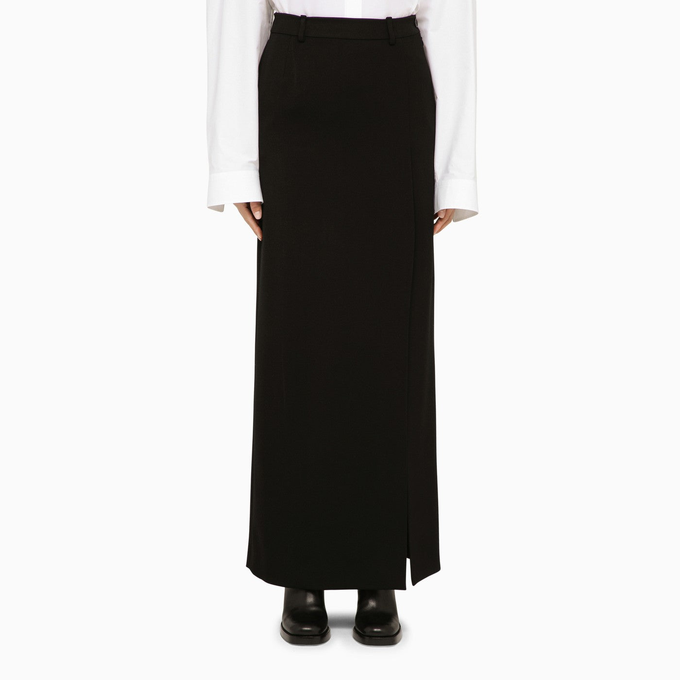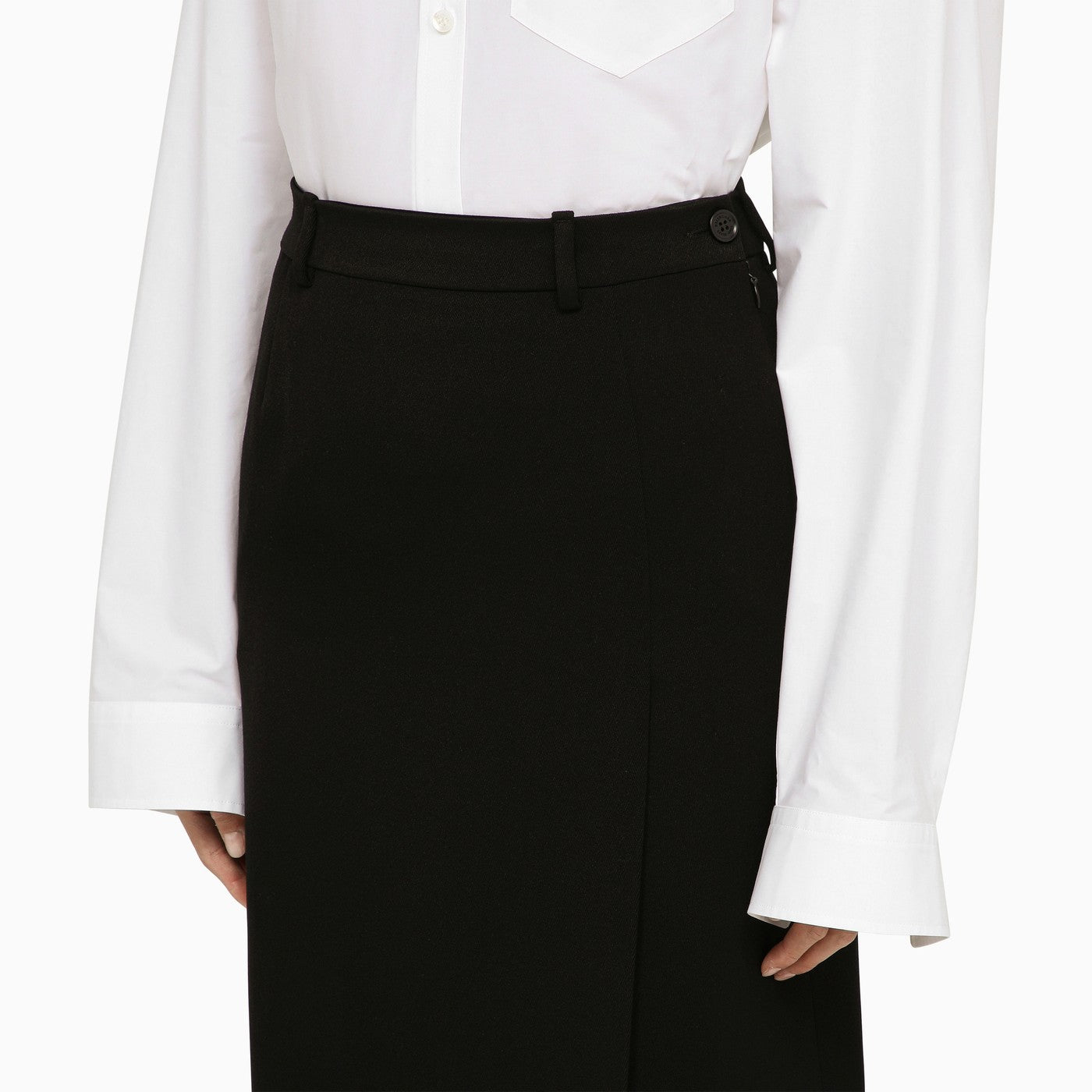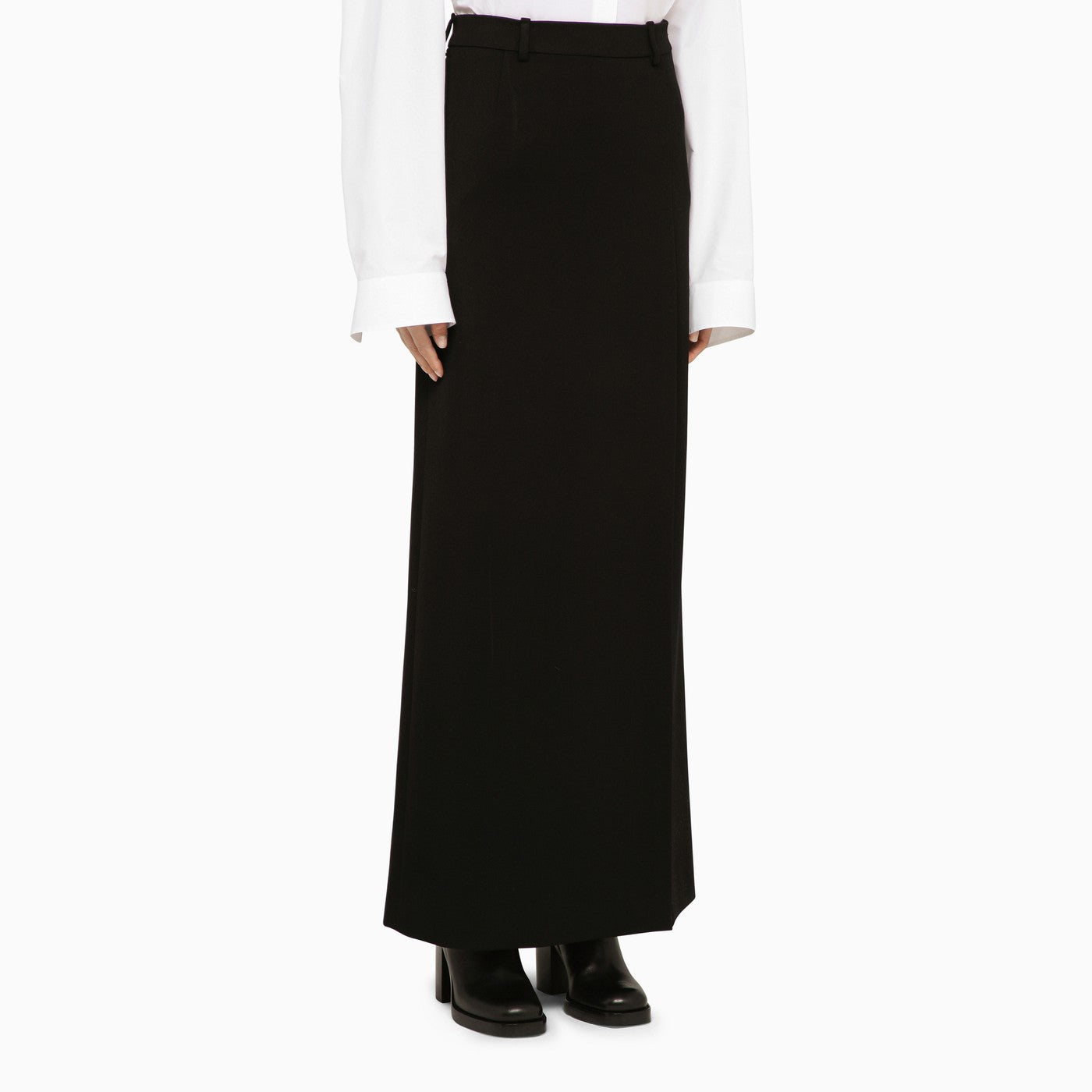Zwarte wol rechte lange rok van Balenciaga met een zip en knoopbanden, riemlussen, een diepe spleet en een weltzak aan de achterkant met een knop.