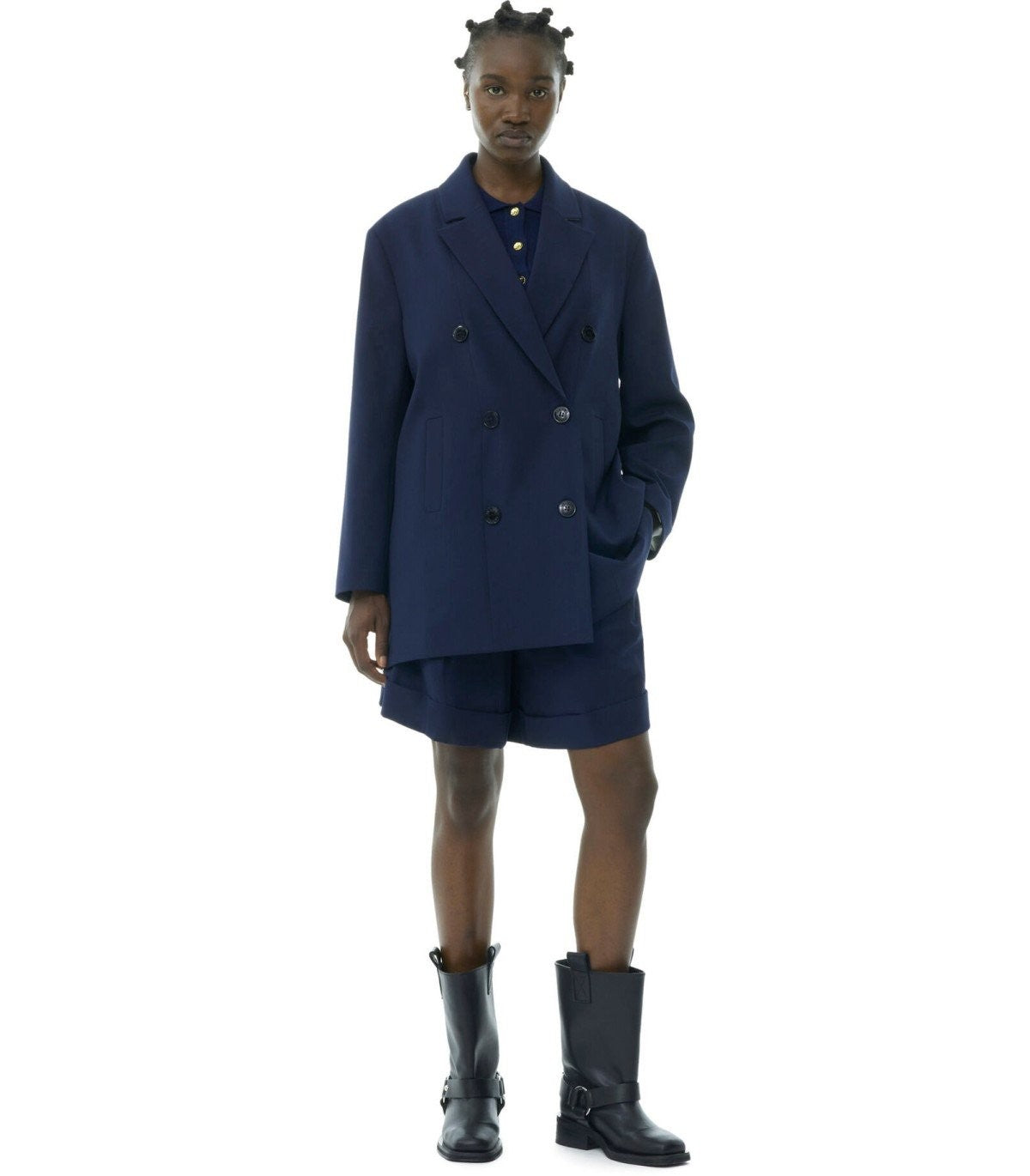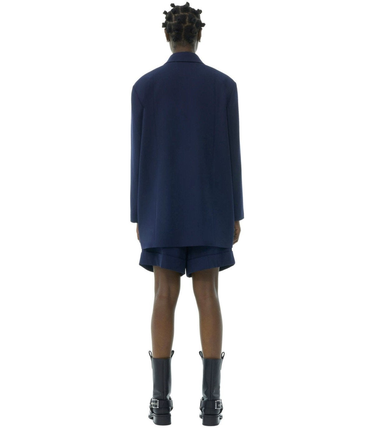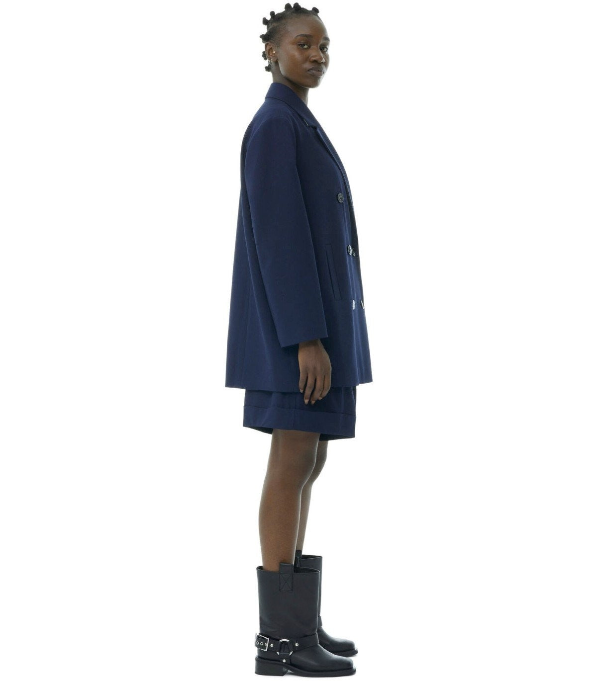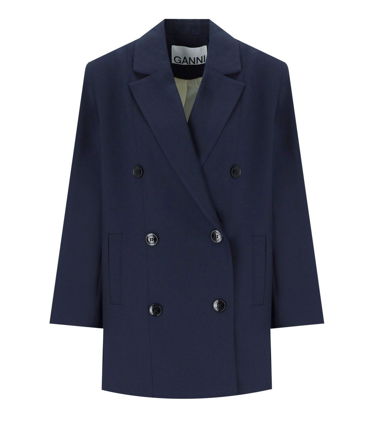 Ganni Blazer gemaakt van blauwe viscose -blend, met een rechte en extra grote pasvorm. Land in het interieur, gevoerde schouders, sluiting met dubbele borsten met knoppen. Het model is 176 cm lang en draagt ​​maat S/M. Samenstelling: 48% gerecycled polyester, 45% Lenzing ™ Ecovero ™ Viscose, 4% viscose, elastaan, 3% polyester.