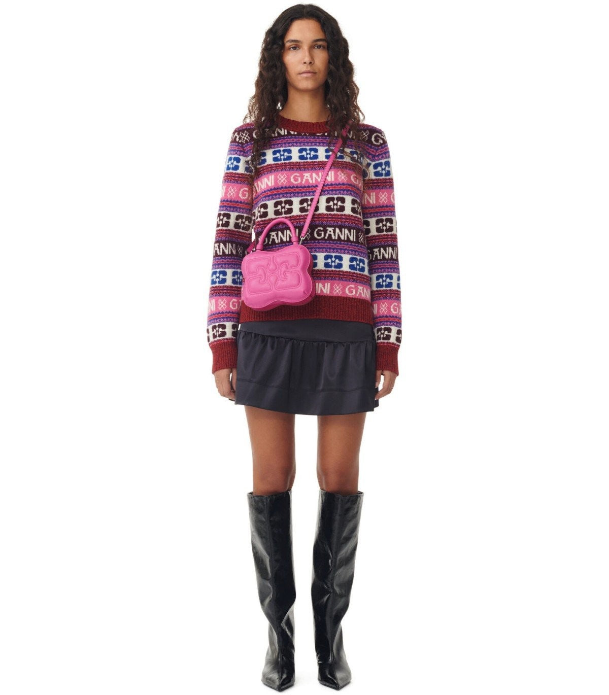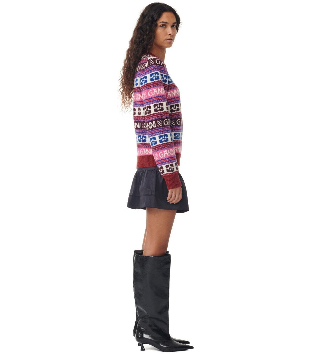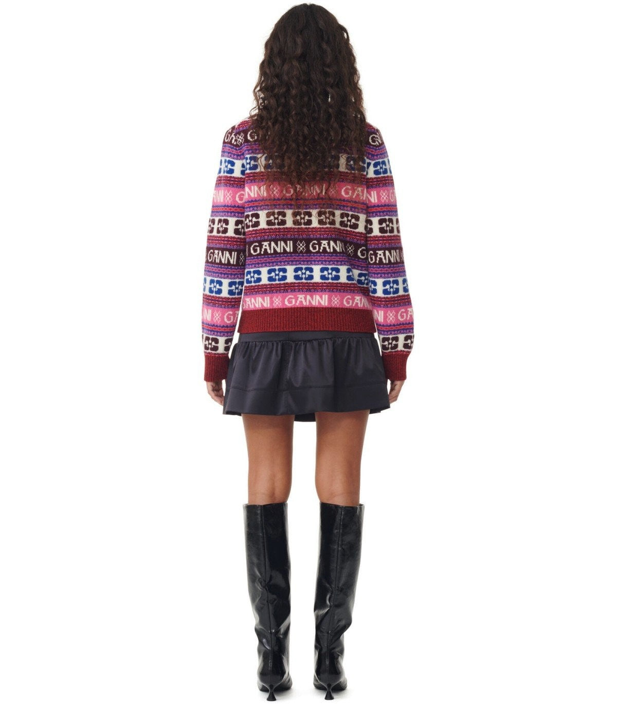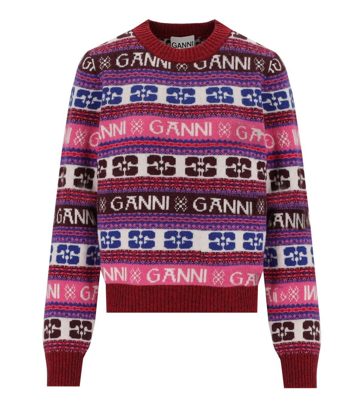 Ganni grafische trui gemaakt van een wolmix met een monogrampatroon in tinten roze, bordeaux en blauw. Geribbelde kraag, manchetten en zoom. Het model is 177 cm lang en draagt een maat S. Samenstelling: 45% wol, 35% gerecycled wol, 20% polyamide.