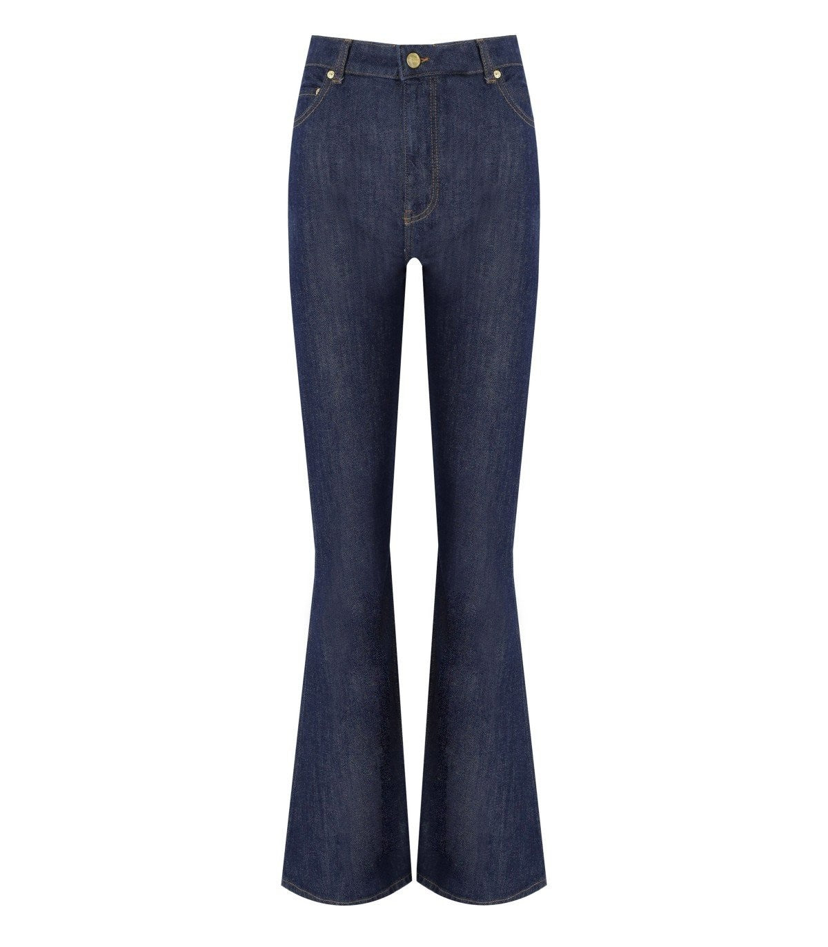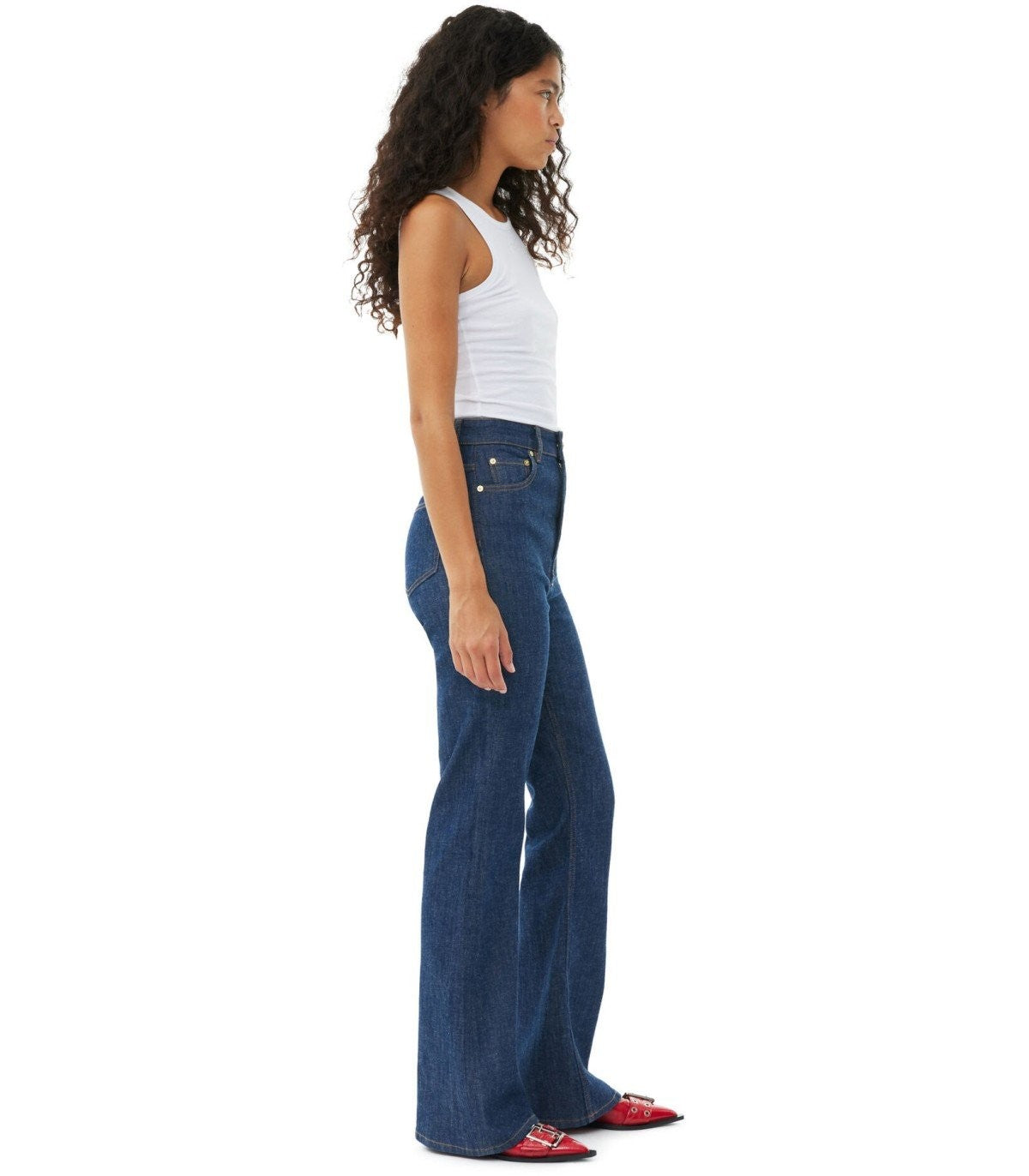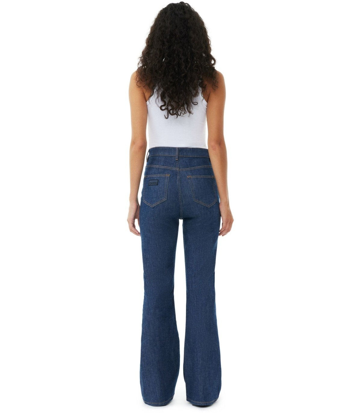 Ganni iry jeans zijn gemaakt van stretch katoenen denim met een donkere wasbeurt. Contrast stiksels, vijf-zak ontwerp en logo-knop en zip-sluiting. Hoog getailleerde, slanke passen op de dijen met een wijd uitlopende bodem. Het model is 179 cm lang en draagt ​​maat 27. Samenstelling: 99% biologisch katoen, 1% elastaan.