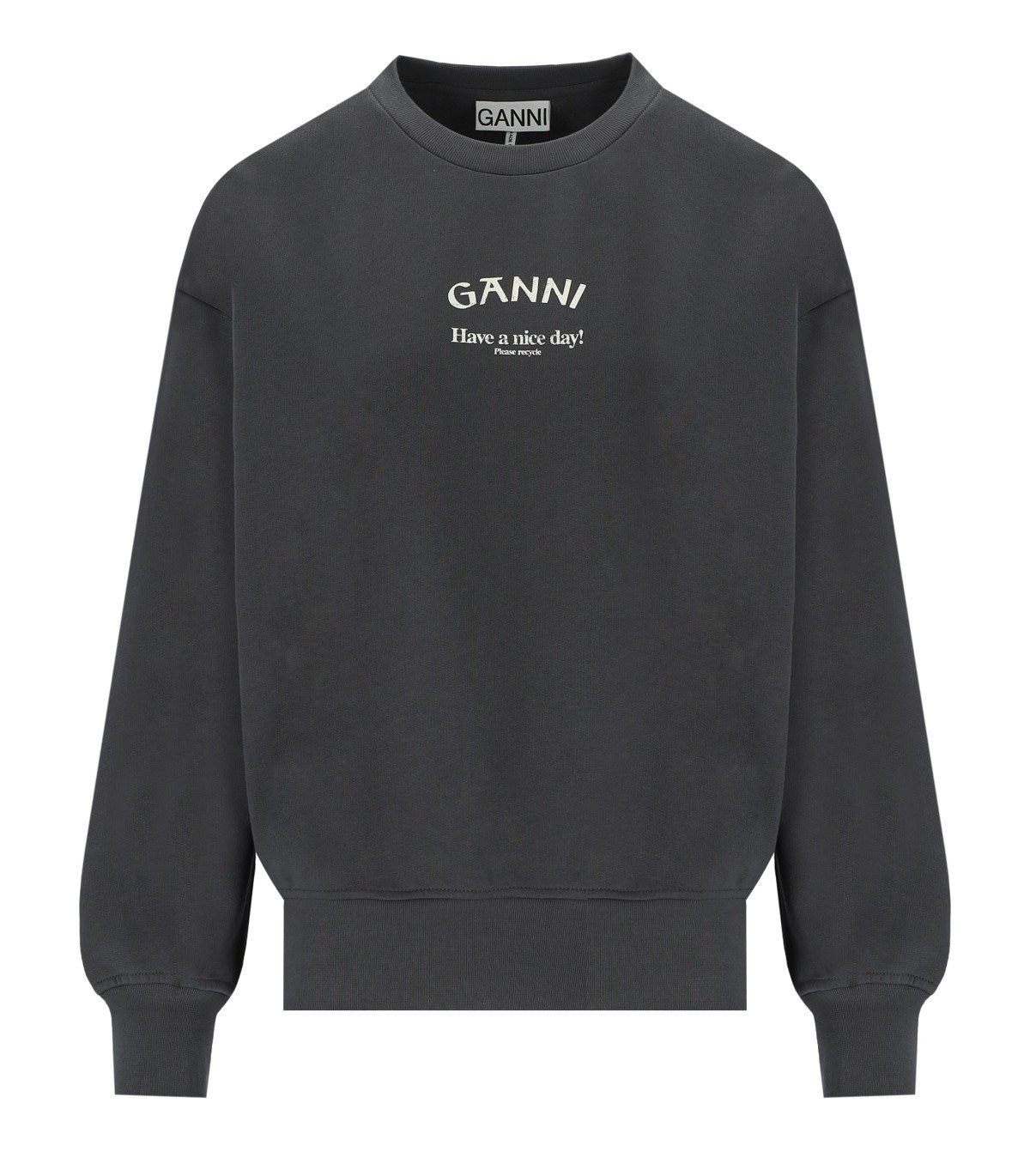 Ganni Sweatshirt gemaakt van grijs fleece katoen met contrasterende logo -print aan de voorkant. Geribbelde kraag, manchetten en zoom. Oversized fit. Het model is 177 cm lang en draagt maat S/M. Samenstelling: 100% biologisch katoen.