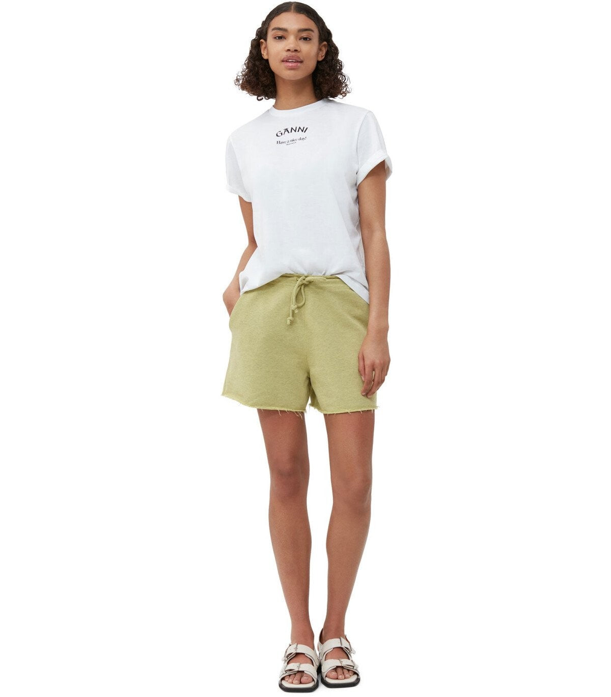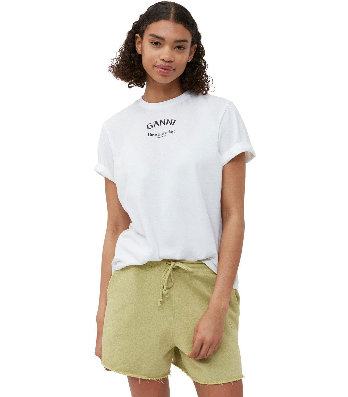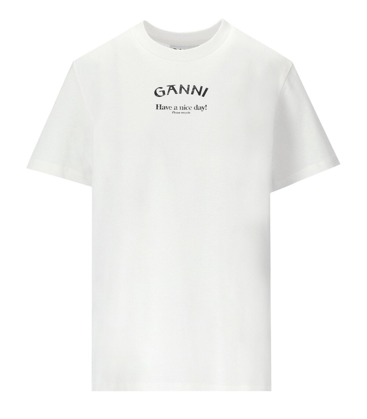 Ganni White Cotton T-shirt met logo-print aan de voorkant. Ontspannen pasvorm. Het model is 178 cm lang en draagt de maat S. Samenstelling: 100% biologisch katoen.