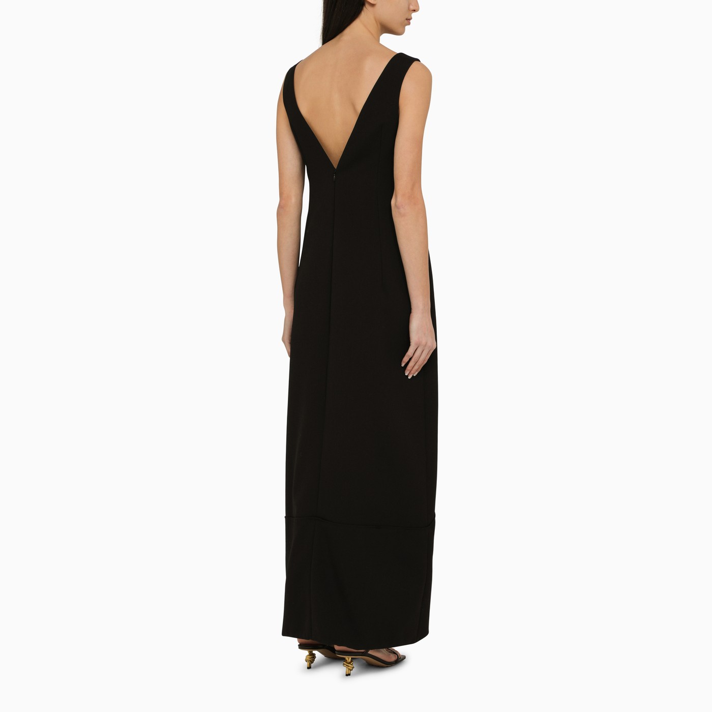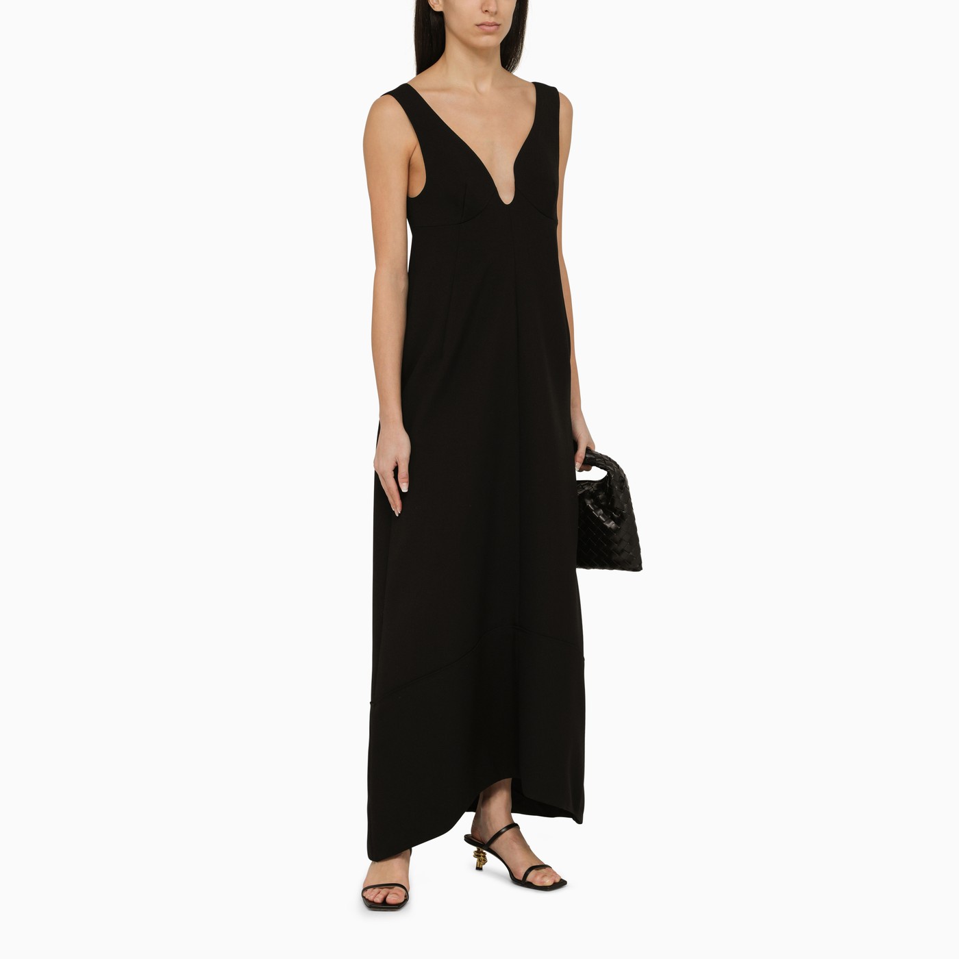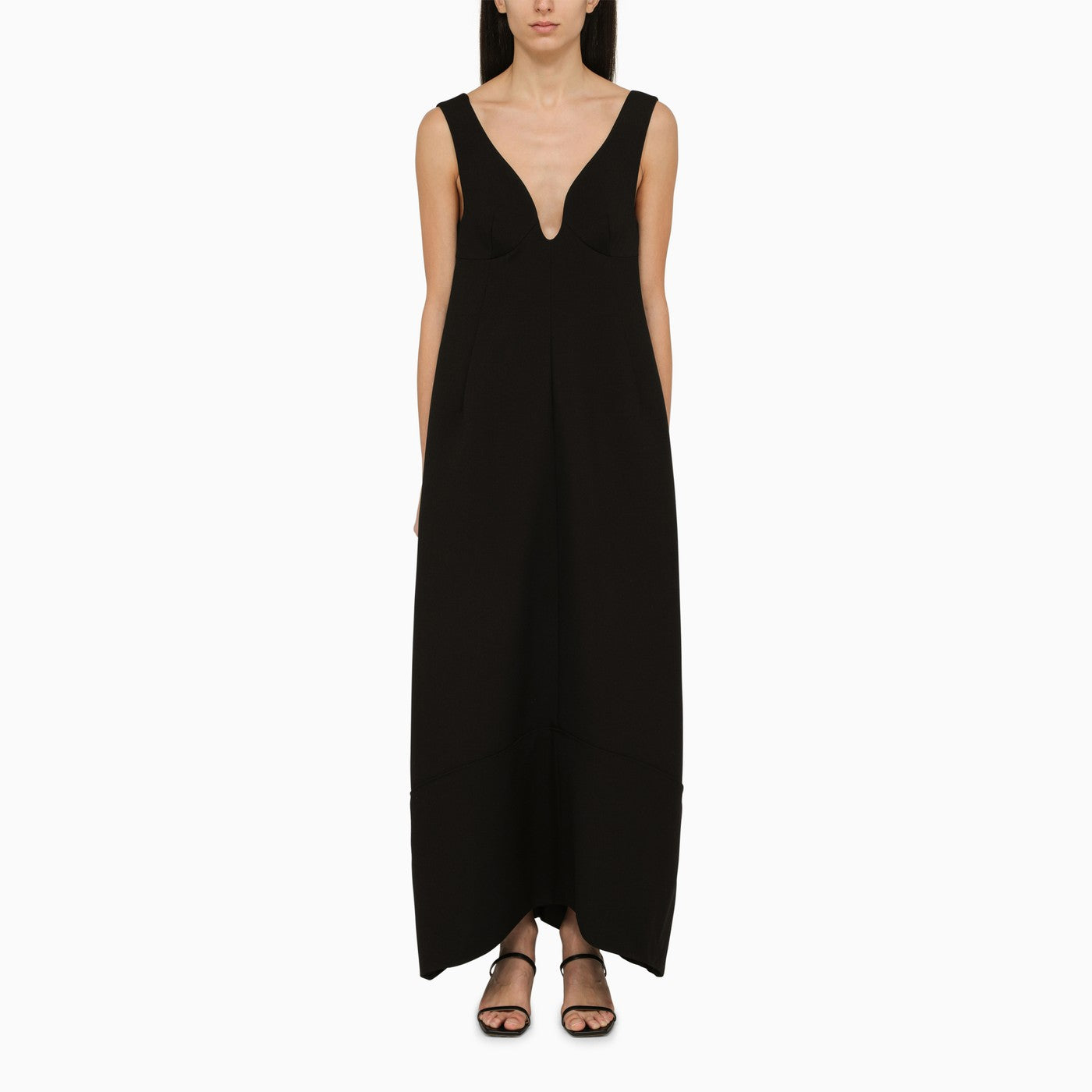 Zwarte wollen mouwloze lange jurk van Jill Sander, met rugzipbevestiging en diepe halslijn voor en achter.