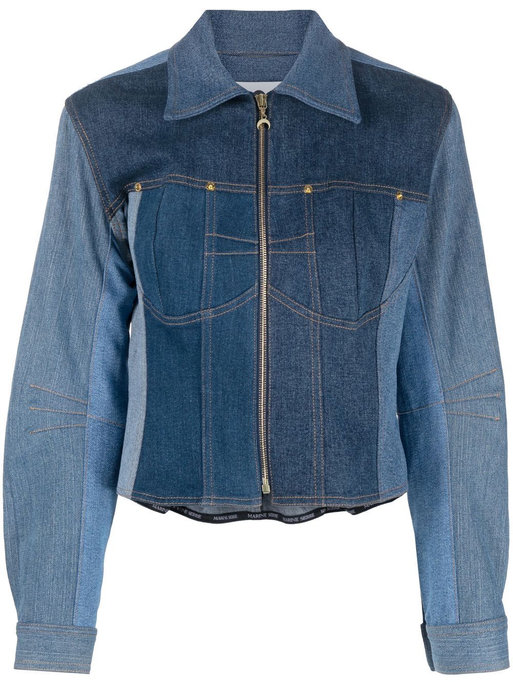 Pandelen met panelen van Marine Serre met blauw, katoen, denim, paneelontwerp, gemonteerde taille, spreiding kraag, aan de voor zip -bevestiging en lange mouwen.