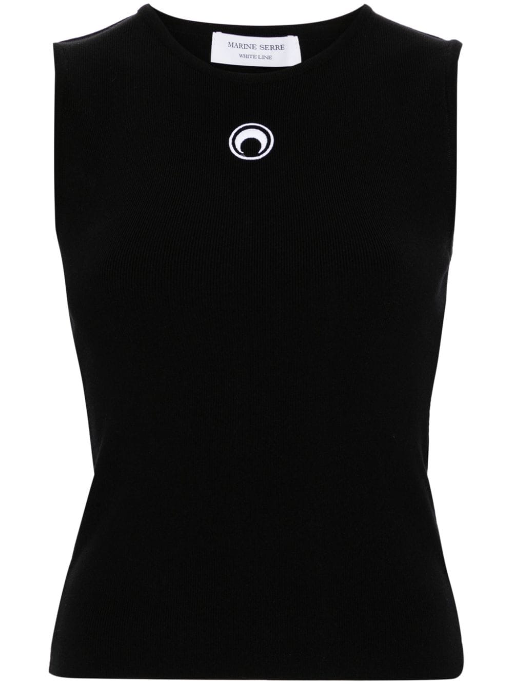 Zwarte fijne geribbelde halve maan borduurwerk bemanning nek mouwloze rechte zoom