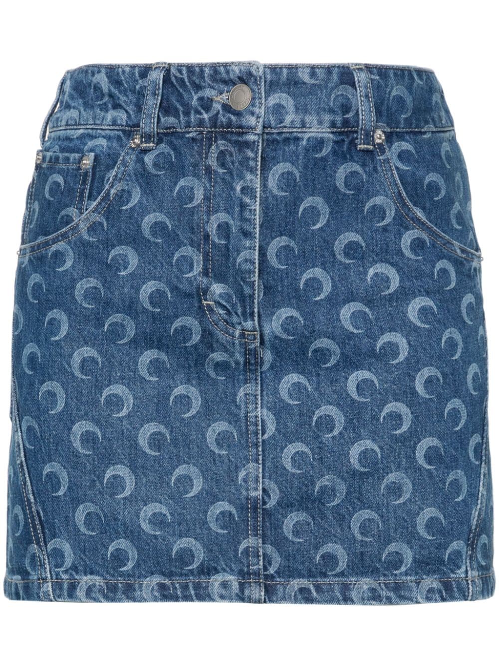 marineblauw katoen denim contrast stiksel halve maan print riem lussen klassieke vijf zakken logo patch naar de achterste ongevoerde verborgen vlieg en knoopbevestiging