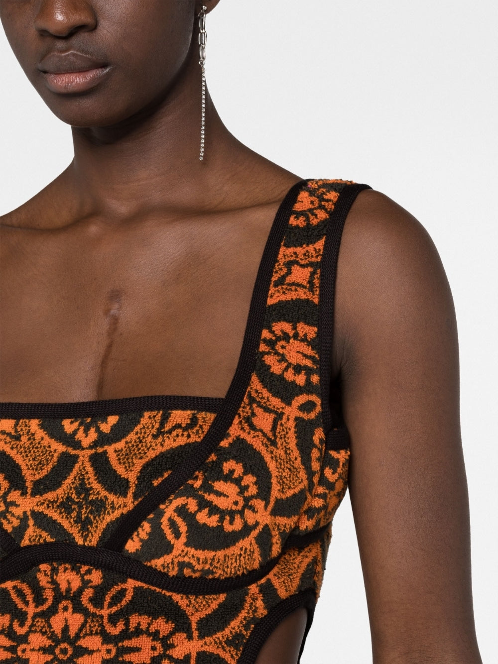 Handdoeken uitgesneden minidress van Marine Serre met zonsondergangsinaasappel, zwart, katoen, uitgesneden details, vierkante nek, verborgen achtervakken achtervak, mouwloos, rechte zoom en dijengte.