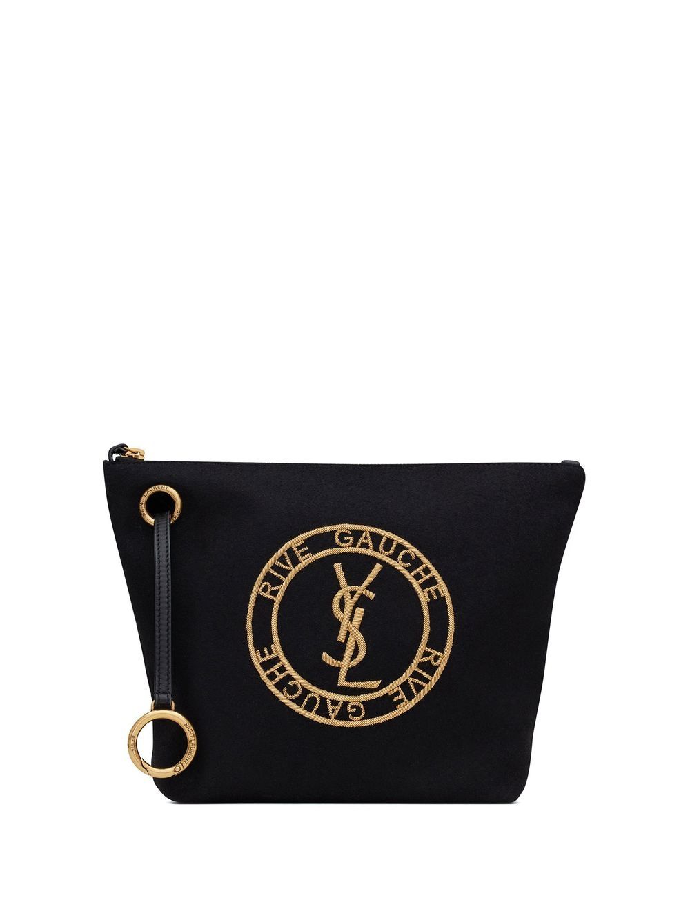 Saint Laurent presenteert deze zip Pochette versierd met YSL Rive Gauche -borduurwerk.