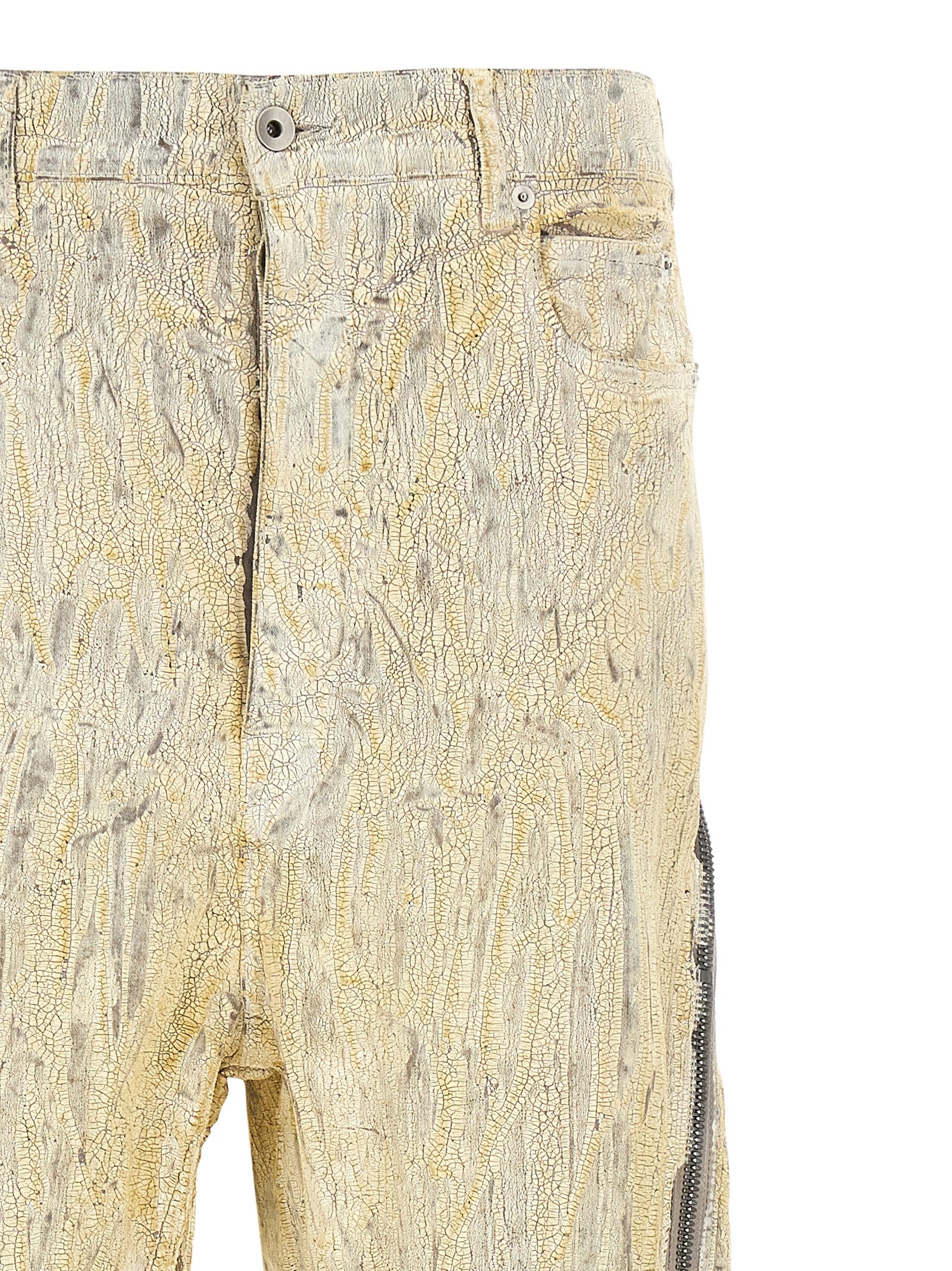 'Bolan Banana' Megacrust katoenen spijkerbroek overgehaald in poeder en behandeld met lagen gouden folie, met hoge taille model met verstelbare laarsbeen dankzij de zip, vijf zakken, knopsluiting, rauw gesneden op de beenbodem. De natuurlijke aspecten van deze behandeling zorgen ervoor dat de toepassing van de film ongelijk is, afpellen en in sommige gebieden barsten en zullen dit blijven doen met slijtage en slijtage. Dit is een intrinsiek kenmerk van dit type behandeling en is een gewenst visueel aspect dat bijdraagt aan het uniekheid van elk stuk en niet als een defect moet worden beschouwd.