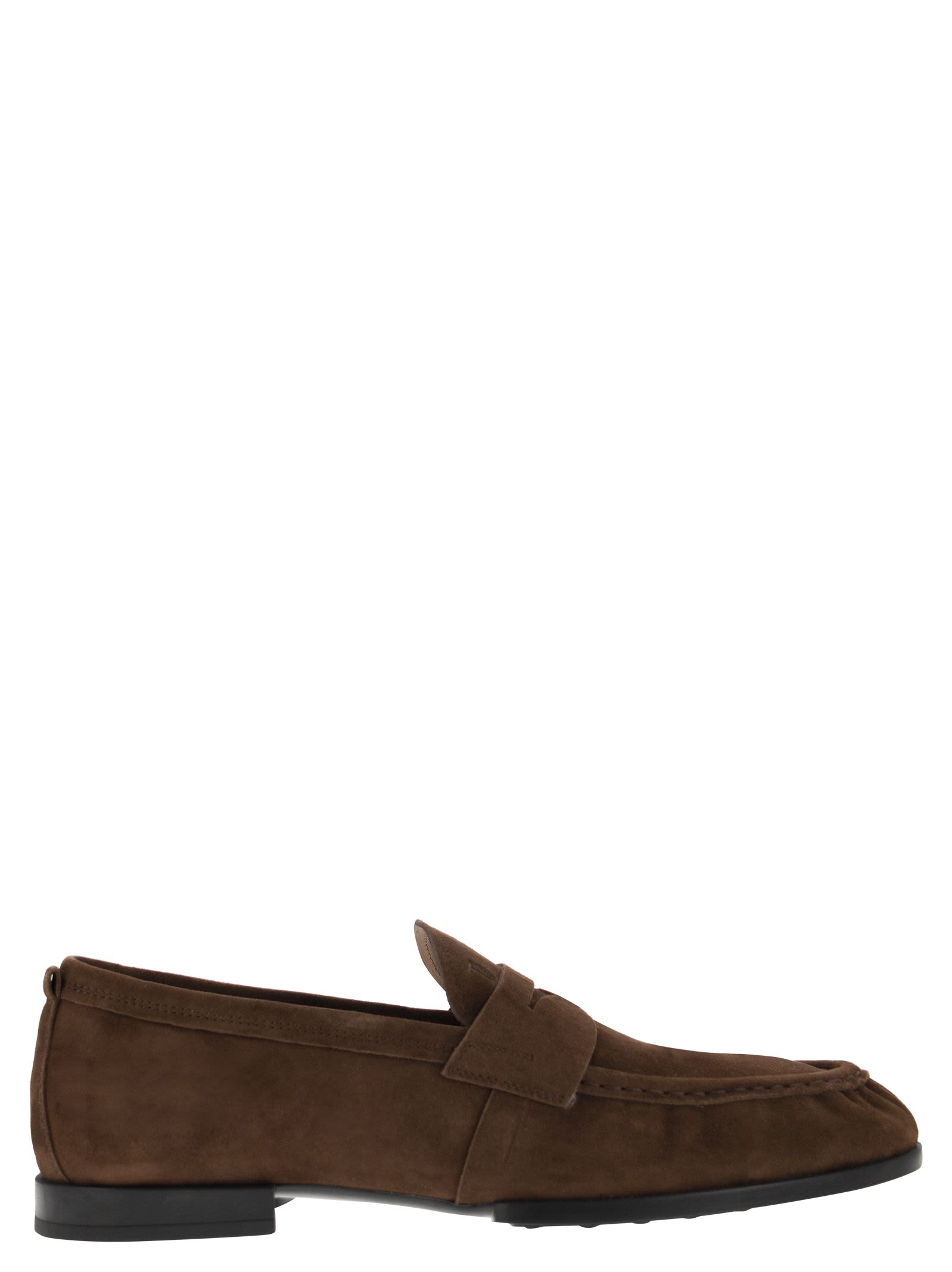 Rijke suede mocassin met licht gebruikt effect, masker, ruches op de teen, in reliëf Tod 's Monogram, rubberen zool met reliëf rubbers en hoefijzervormige hiel. - FaceMask - Blootgestelde handstiksels - in reliëf Tod 's Monogram Designer ID: XXM02E0EC60OA6S610