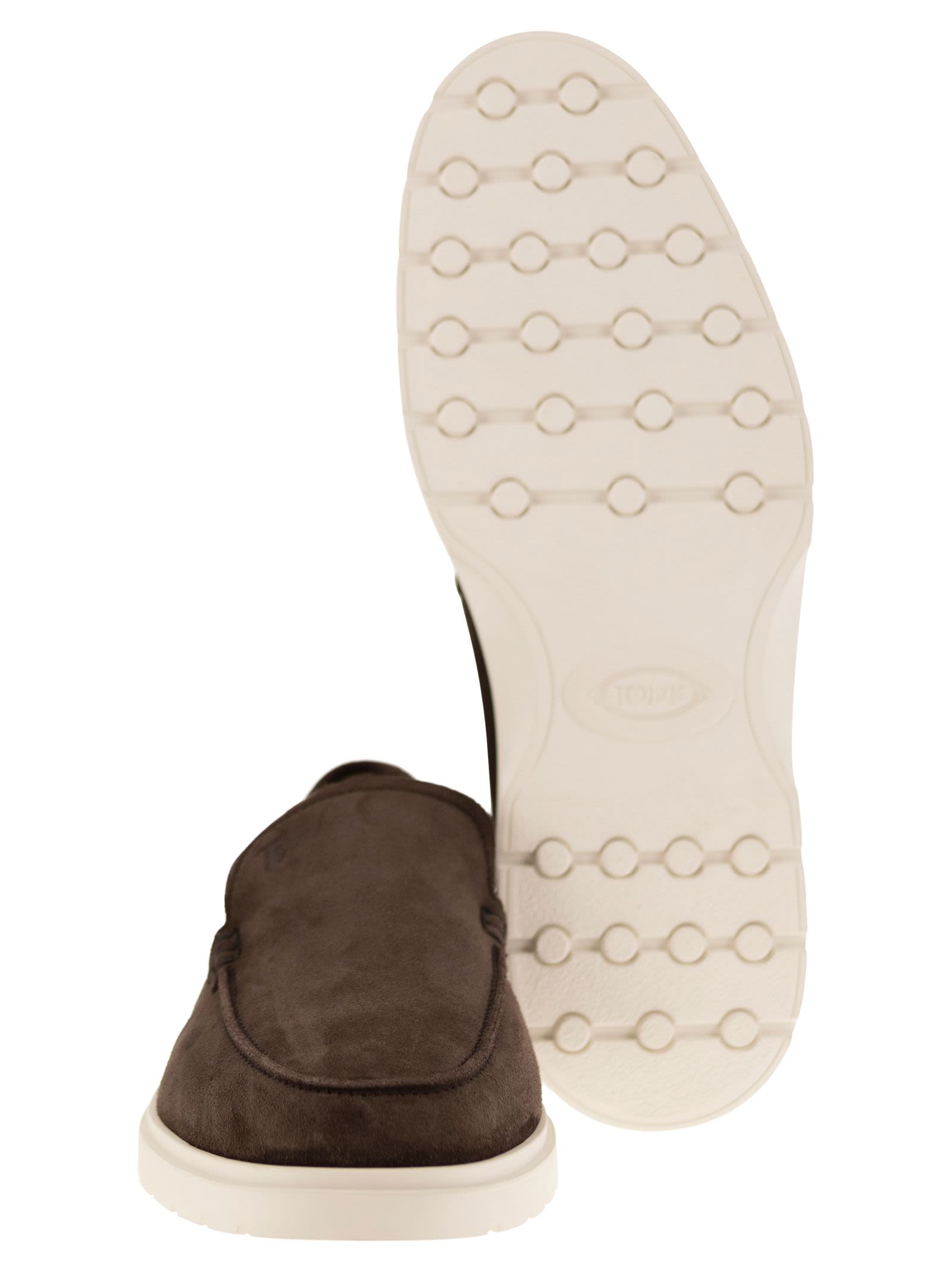 Slipperversie mocassin gemaakt van rijk suède leer, met tod 's Monogram reliëf op de voorkant. Met een rubberen zool met groeven en reliëf rubberen doorvoertules, is het een model met een informele en informele bui, verrijkt door de iconische rubberen doorvoerten op de hiel. - gemaakt in Italië - mocassin met rubberen zool - suede lederen bovenwerk - in reliëf tod 's Monogram - blootgestelde handstiksels - lederen binnenzool - rubber detail op de hiel - rubberen zool met groeven en reliëf doorvoertules - behuizing met tod 's Logo Designer ID: XXM59K00040M8WS800