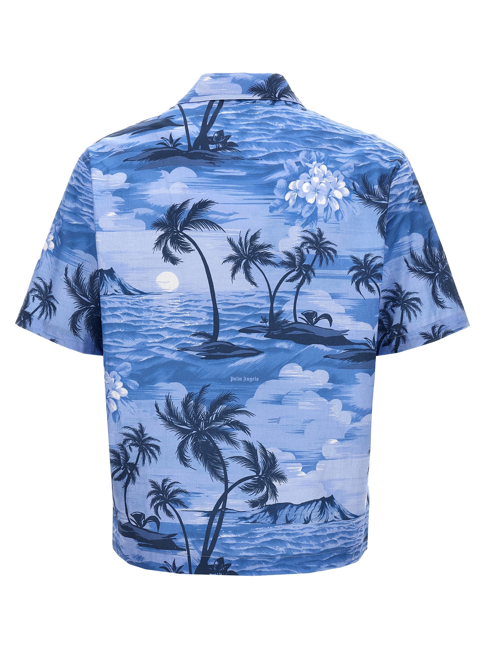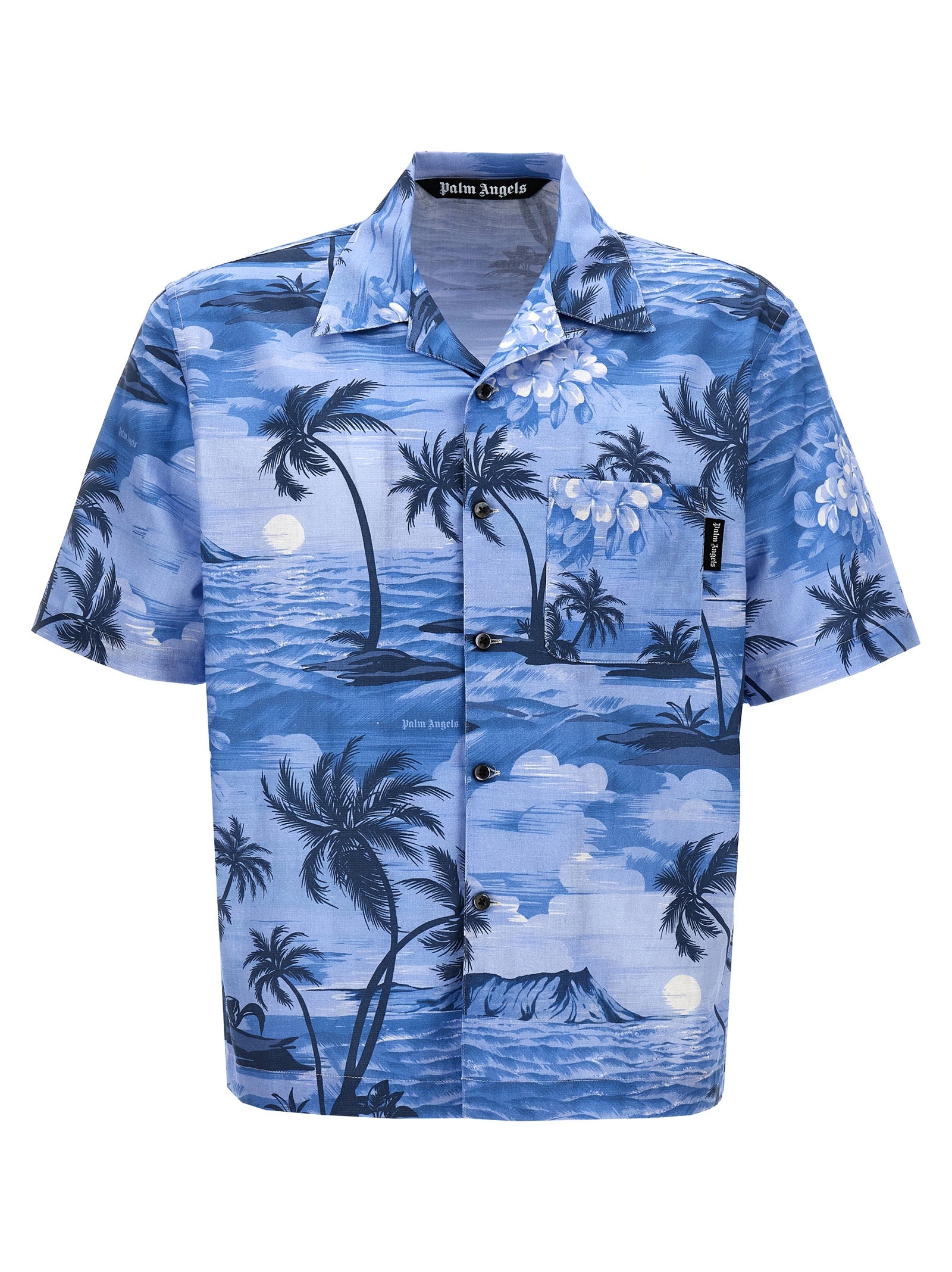'Sunset' linnen en katoenen shirt met all-over afdrukken, voorzak, knoopsluiting, korte mouwen.
