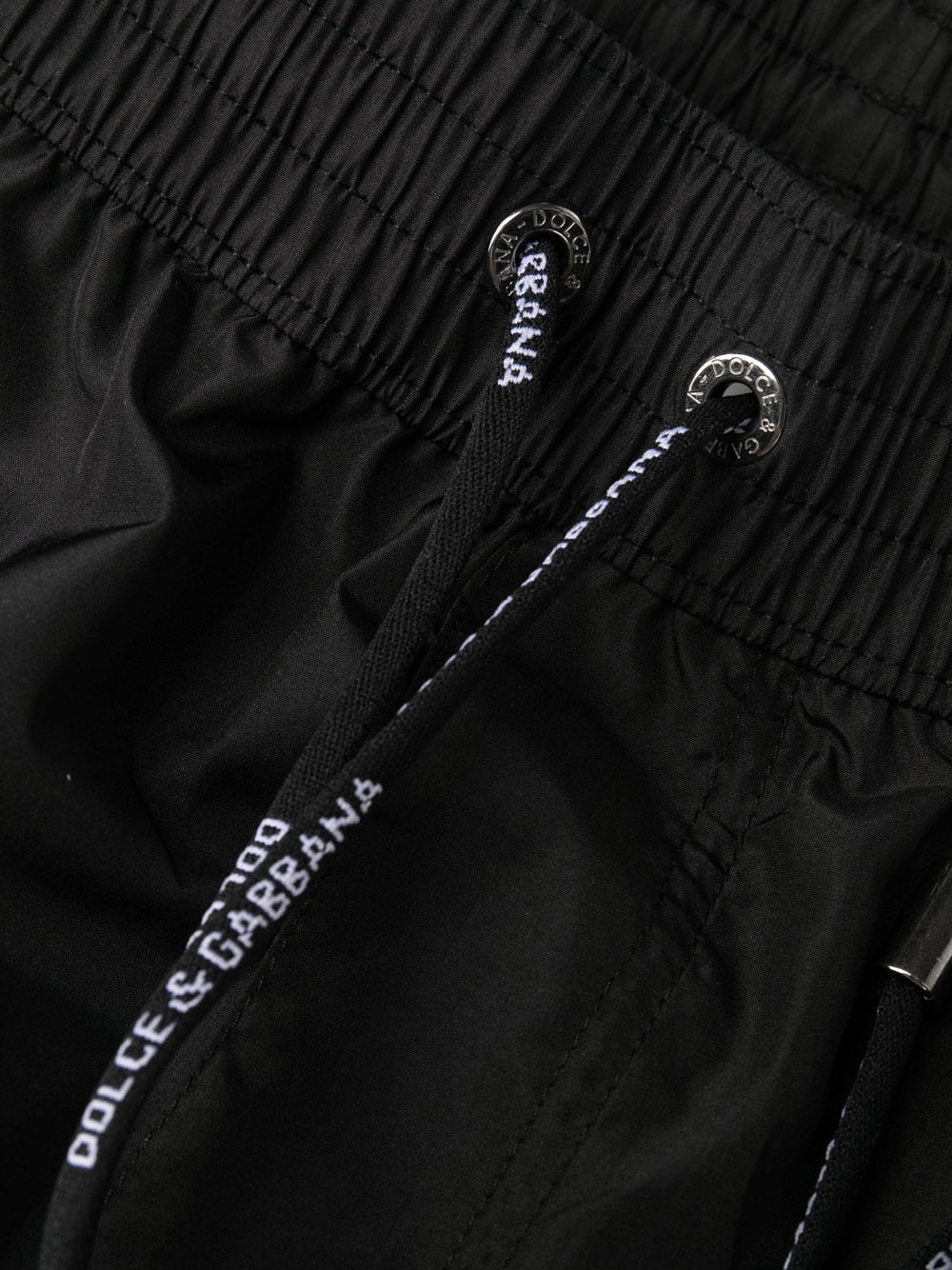 Zwart, elastisch ontwerp, zilveren logo -plaque, elastische taille van trekkoord, rugzakje, rechte snit en boven de knielengte. Swimpakken moeten worden geprobeerd tijdens het dragen van je eigen onderkleding.