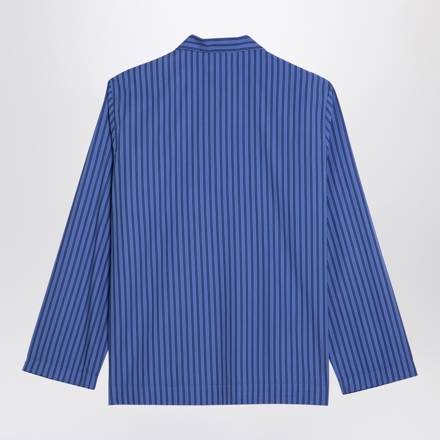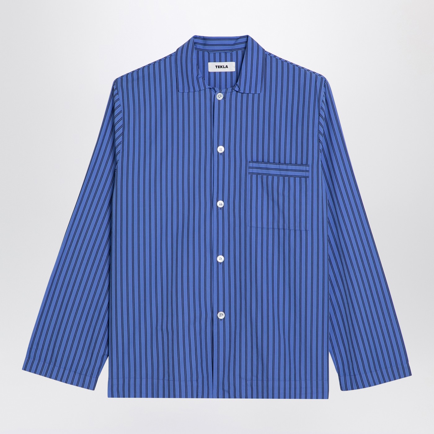 Lichtblauw gestreepte organische katoenen pyjama -shirt van Tekla met lange mouwen, een voorste knoopplacket, een klassieke kraag, een letterslogo -tag aan de zijkant en een rechte zoom.