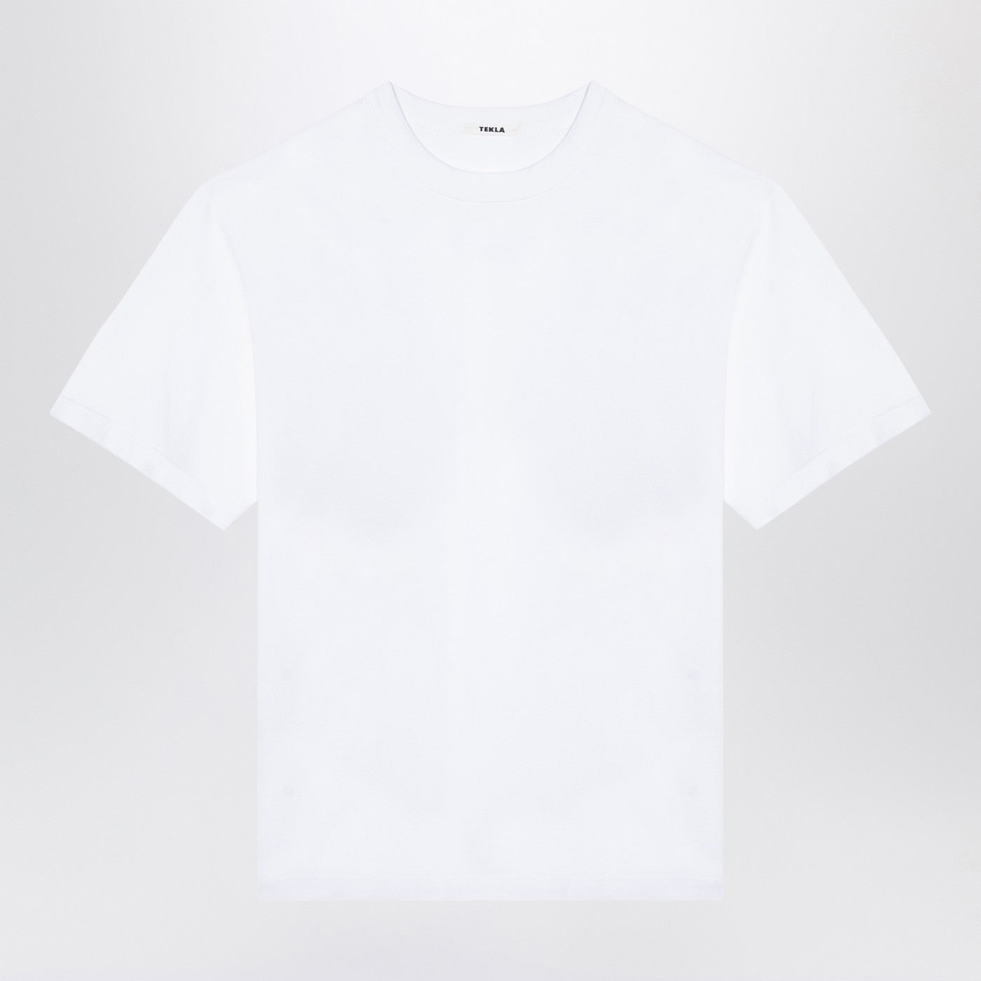Witte organische katoenen crew-neck pyjama-trui van Tekla met korte mouwen, zijlogo-plaquette en rechte zoom.