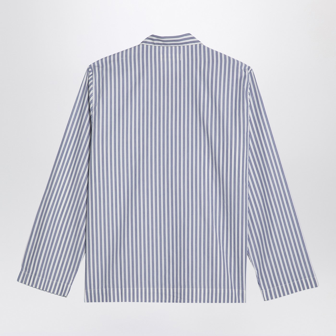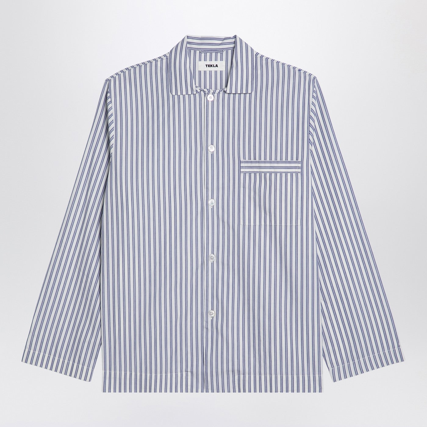 Wit organisch katoenen pyjama -shirt met lichtblauwe strepen van Tekla, met lange mouwen, een placket voor de voorkant, een klassieke kraag, een letterslogo -plaquette aan de zijkant en een rechte zoom.