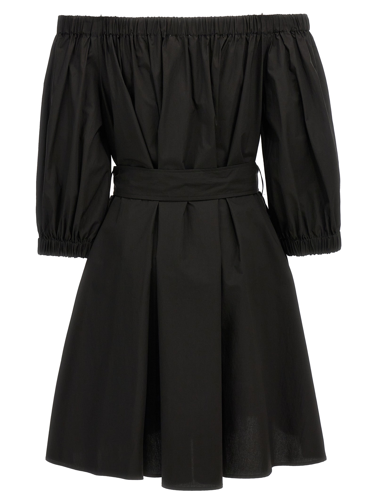 'Canyox' off-the-shoulder katoenen jurk met elastische halslijn, afsluiting voor knoop, riem aan de taille, zakken, lange mouwen met elastische manchetten.