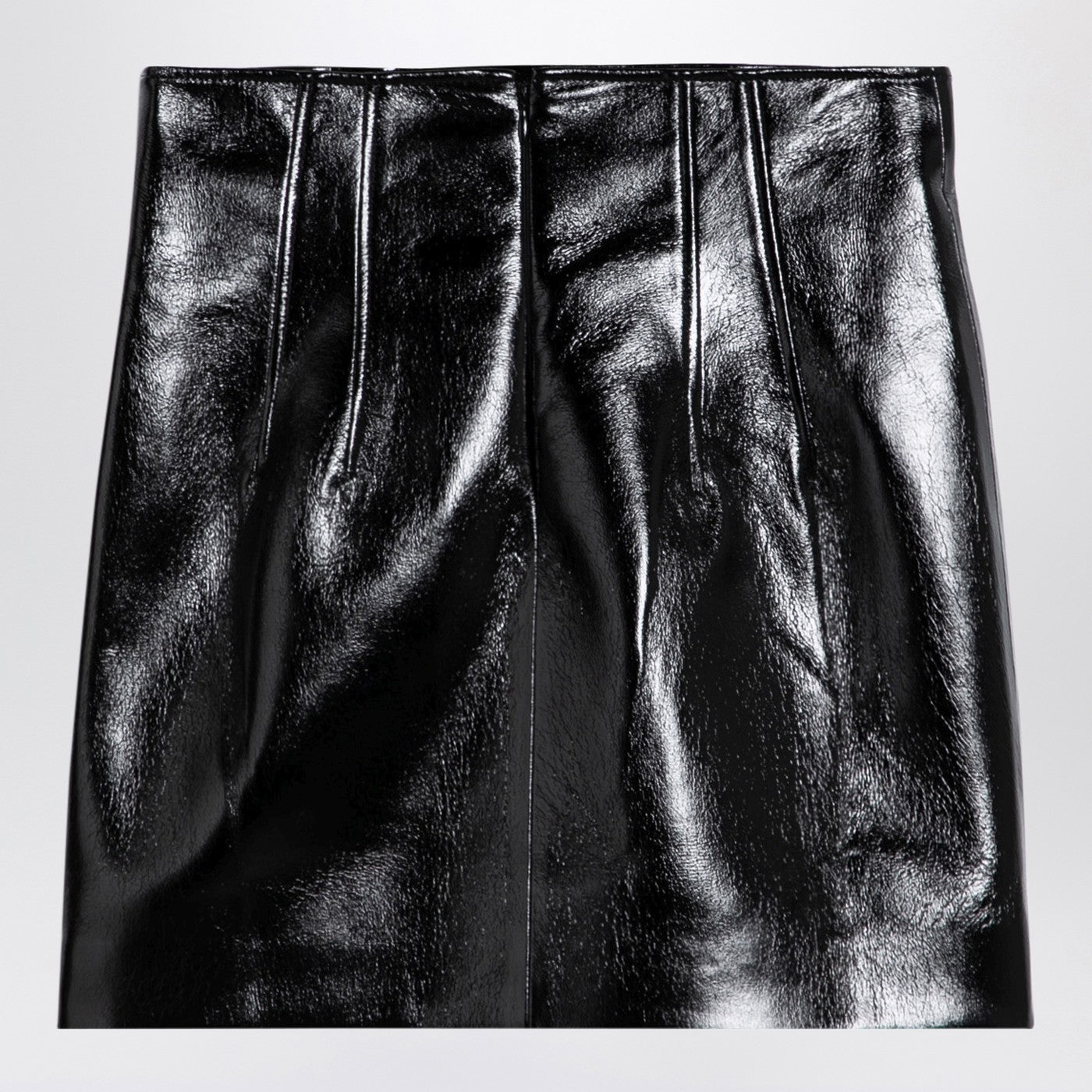 Mini-rok bij de Andamane gemaakt van zwart veganistisch leer, met een hoog getailleerd ontwerp en rugzip-bevestiging.