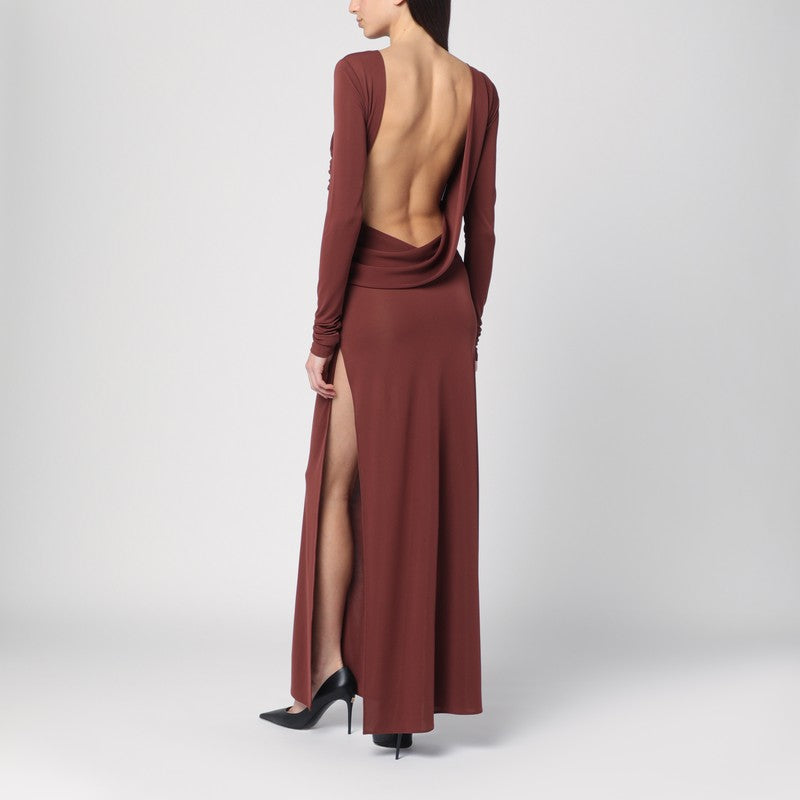 Lange jurk bij de Andamane in cacaopleur, gekenmerkt door een verzameld ontwerp aan de zijkant, lange mouwen, een achterhals en een brede zijsplitsing.