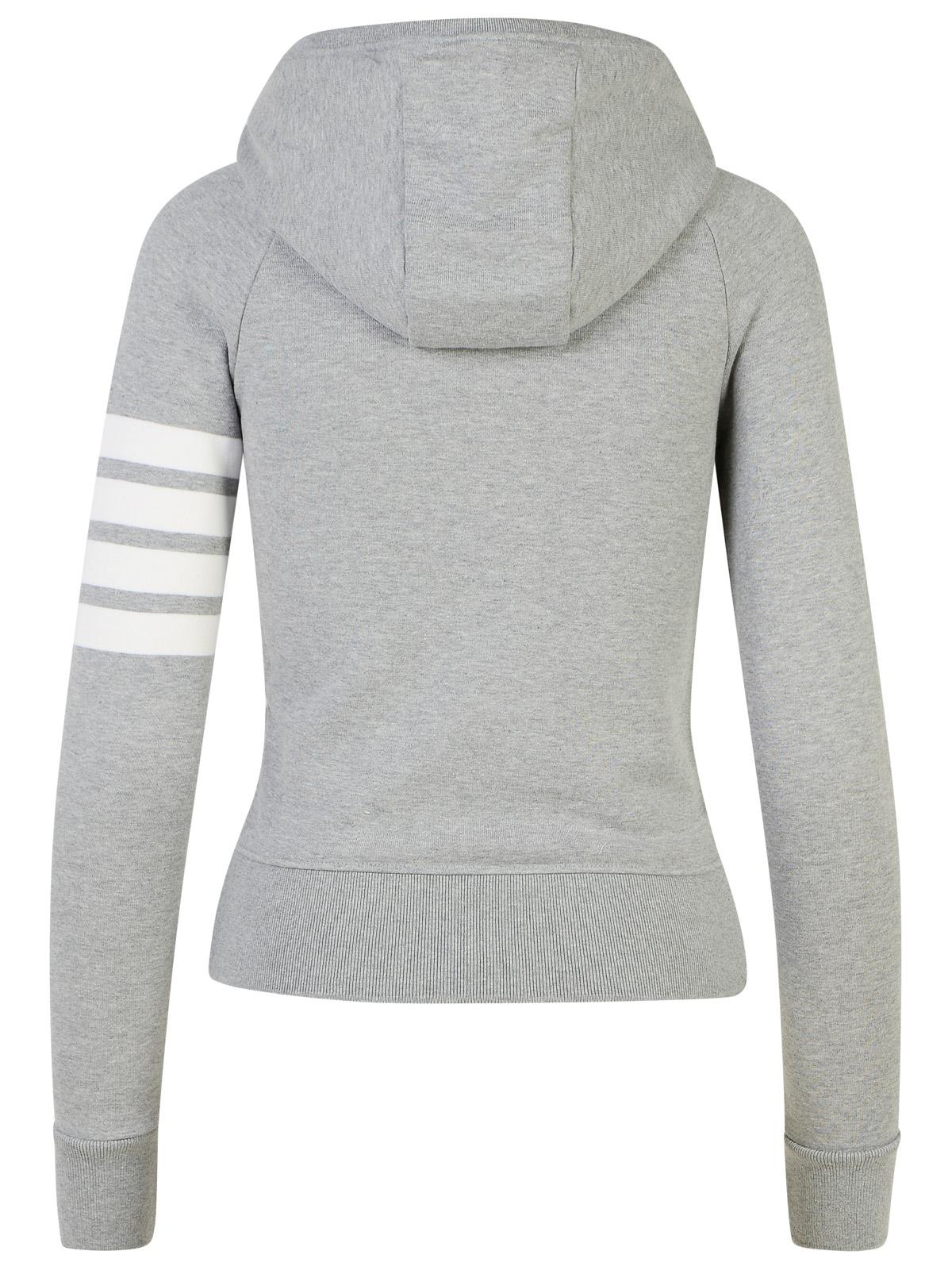 Drawstringkap, twee zakken spleetzakken, wit logo -label, volledige ritssluiting, contrastlogo op de linker mouw, geribbelde manchetten en zoom, logo -tabblad dat in de achterkant van de kraag is gestikt