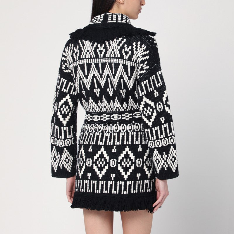 Cardigan van Alanui in een mix van maagdelijke wol en zwart -wit katoen, gekenmerkt door decoratieve franjes aan de randen, lange mouwen, een taille riem en twee zijkant -zakken.