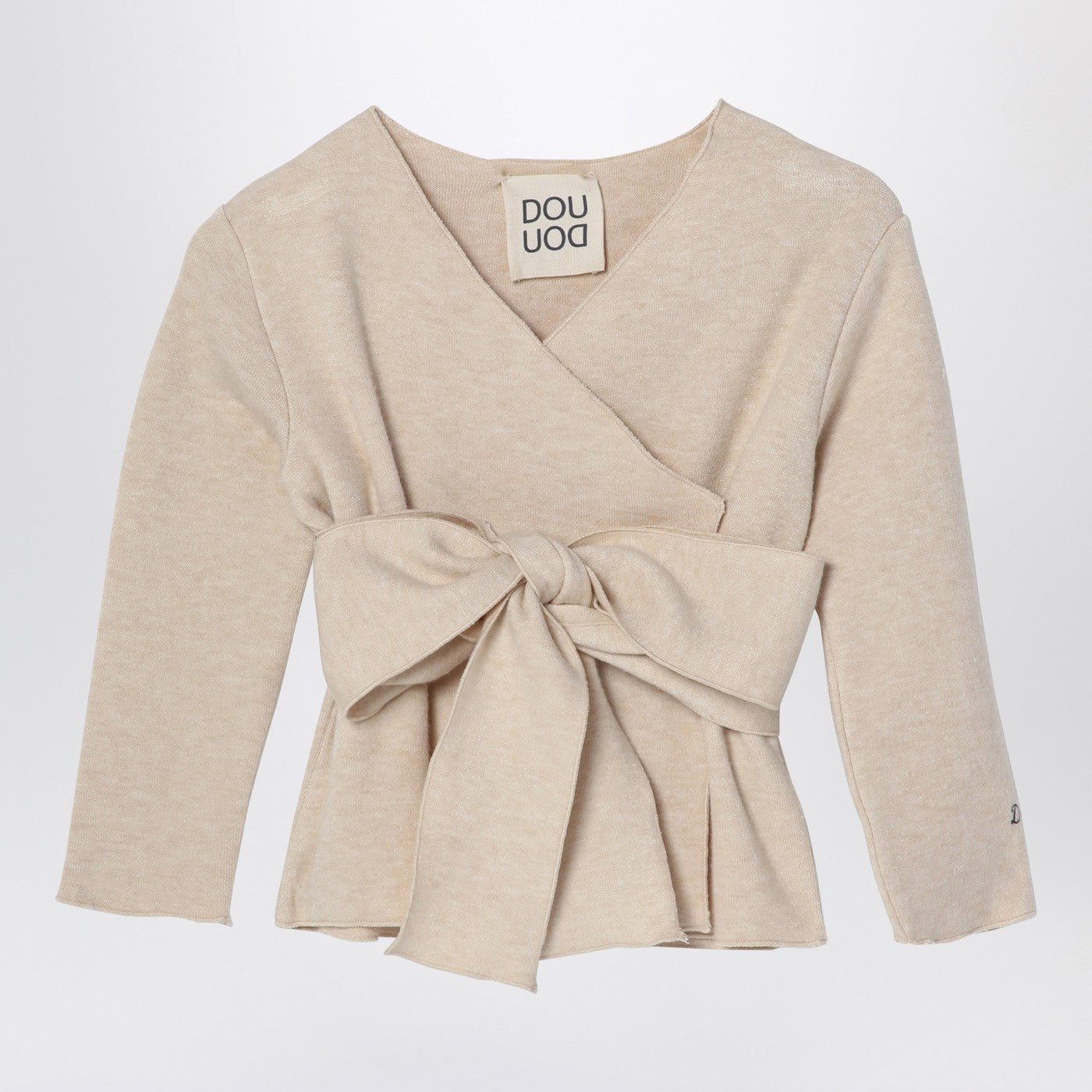 Beige viscose-mix Cardigan van Douuod met een V-hals, een voorste cross-over bowbevestiging en lange mouwen met logo-letters op de pols.