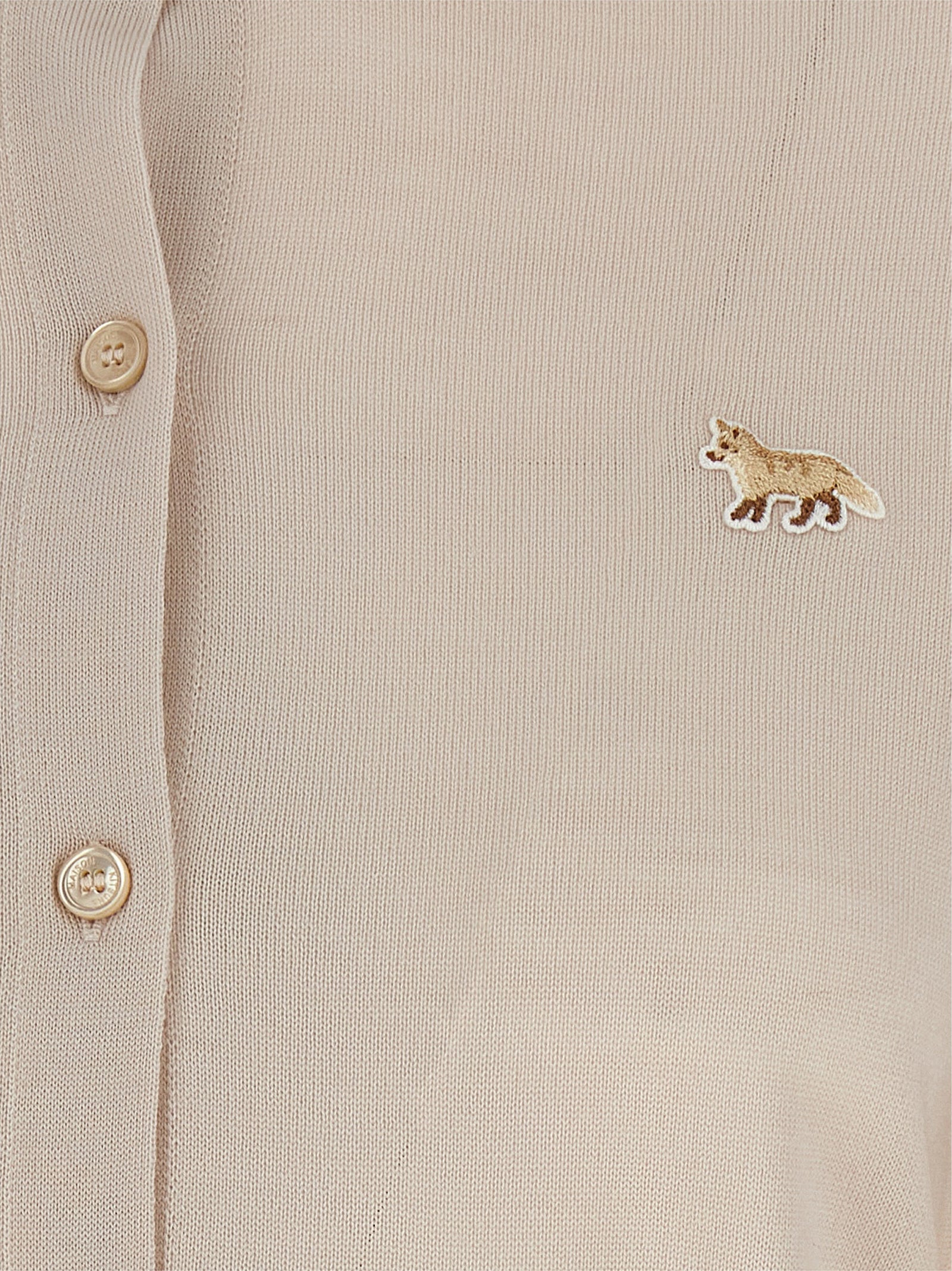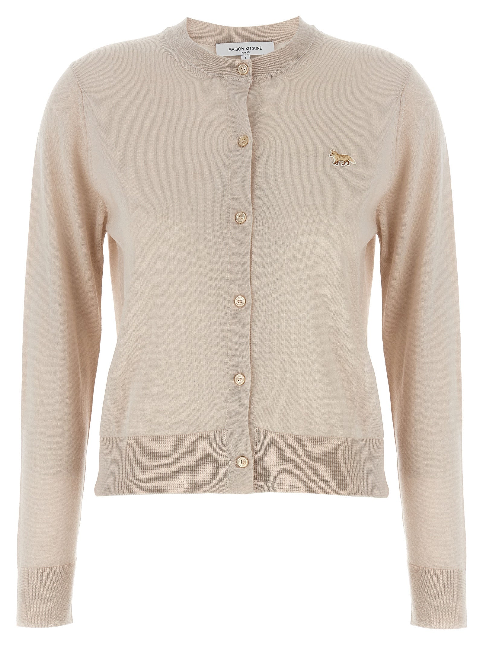 Fijn Merino Wool Cardigan, voorste 'Baby Fox' Patch, Crew Neck, Sluiting voor knoop, lange manchetmouwen.