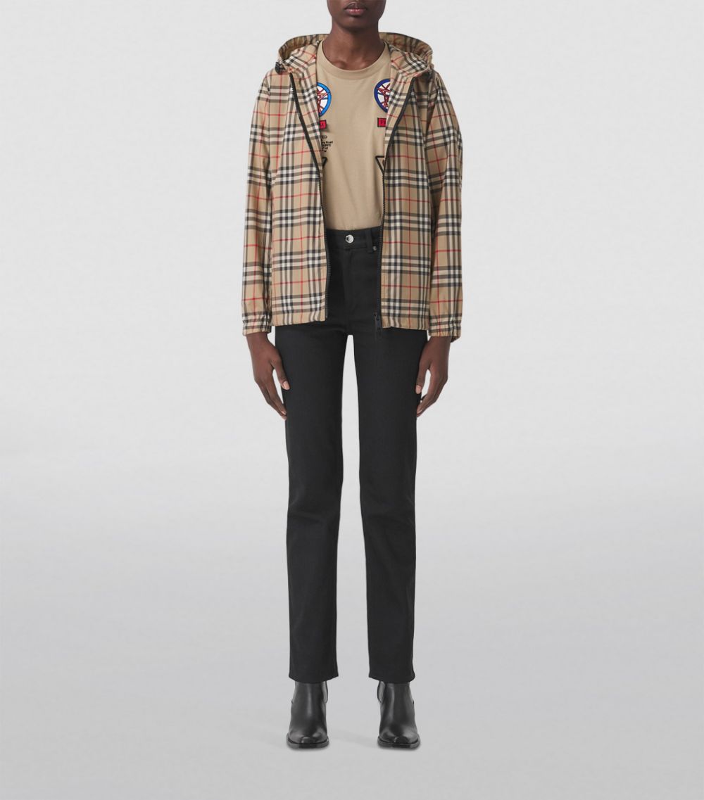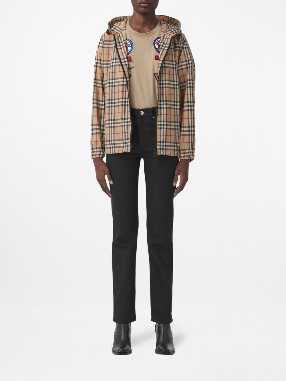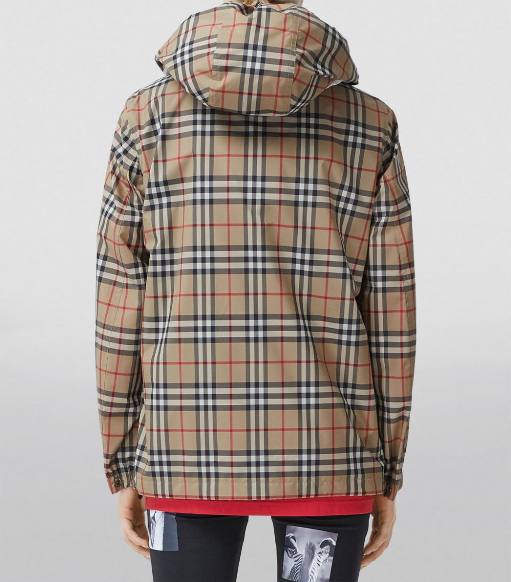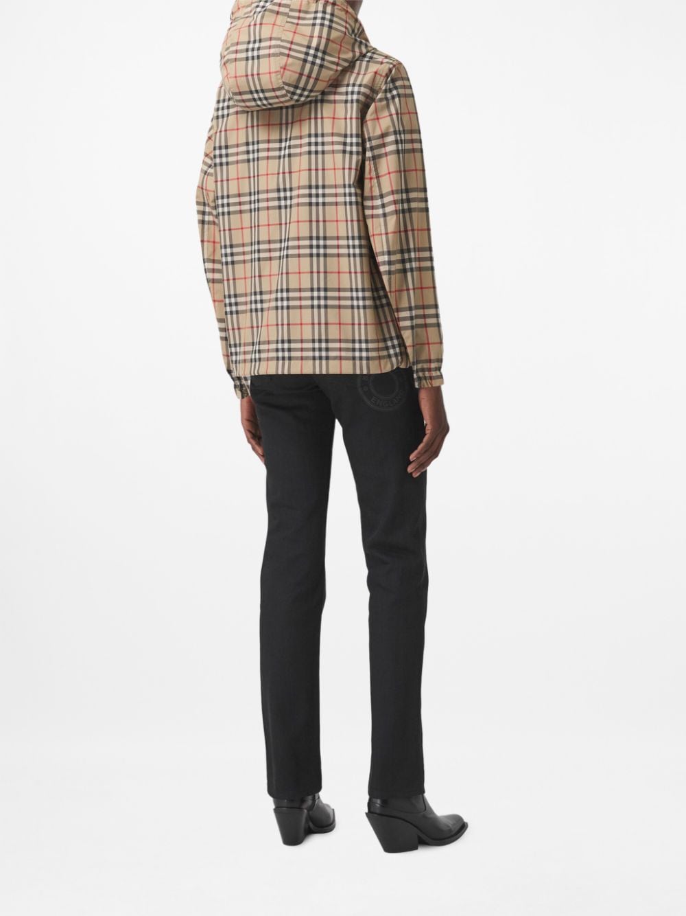Vintage Check-capuchon Jacket van Burberry met archief beige, vintage checkpatroon, trekkoordkap, aan de voorste ritssluiting, lange mouwen en twee zakken zip-fasterende zakken.