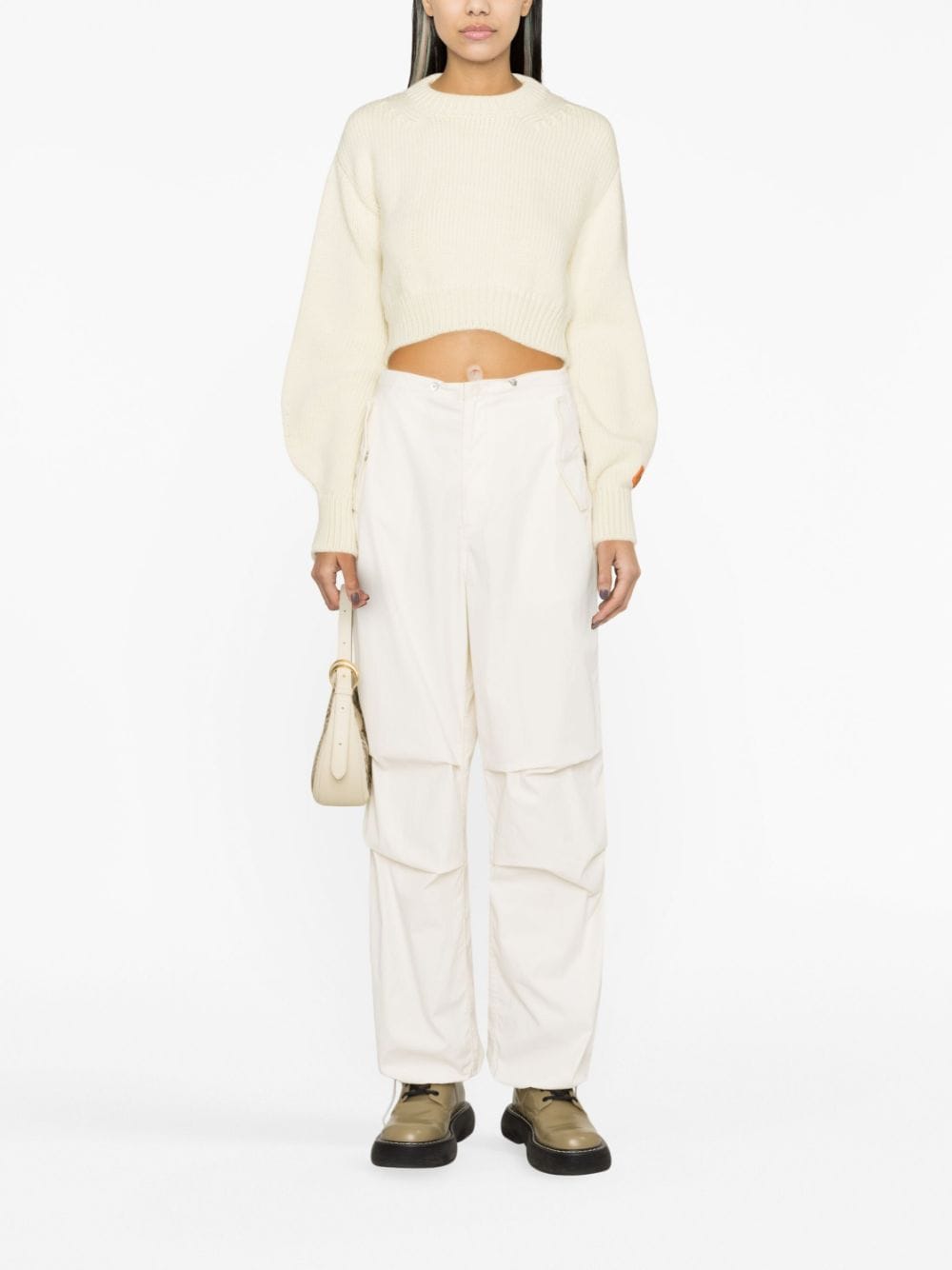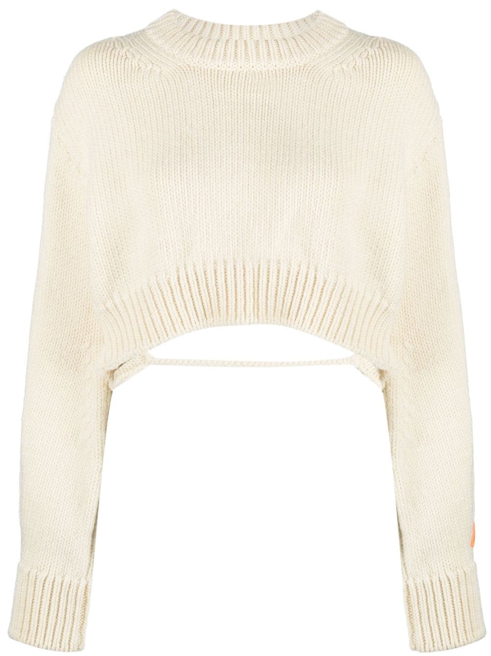 Open-back bijgesneden wollen trui van Heron Preston met gebroken witte, wol, gebreide constructie, logo-patch bij de mouw, open rug, bemanningsnek, lange mouwen en rechte zoom.