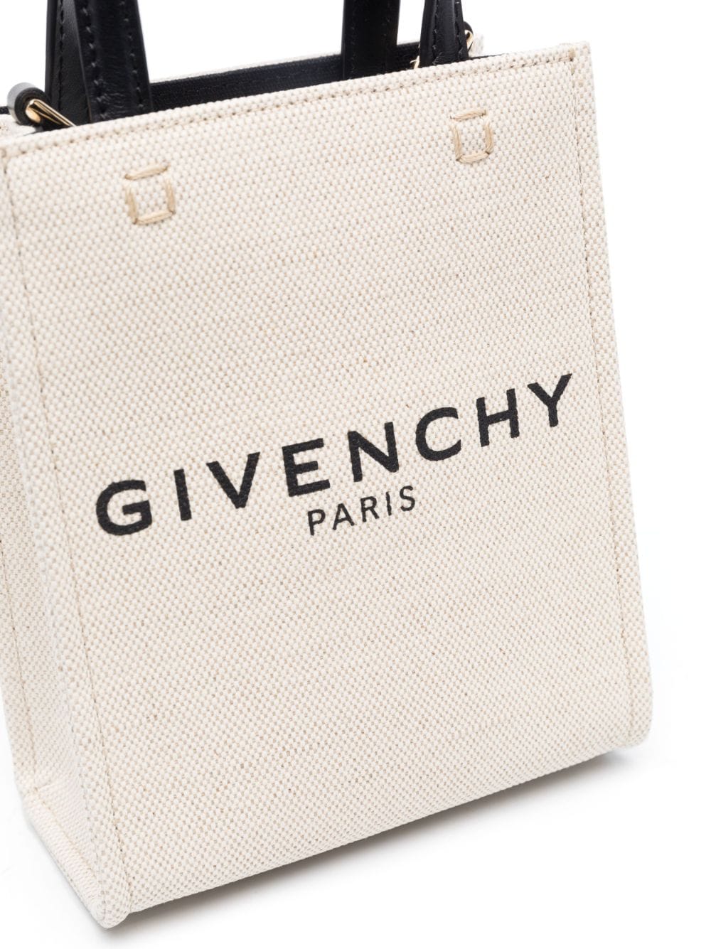 Logo-printtas tas van Givenchy met tonale stiksels, logo-afdruk aan de voorkant, faux-lederen bovenste handgrepen, faux-lederen en ketting-link schouderband, hoofdcompartiment en licht beige/jetzwart.