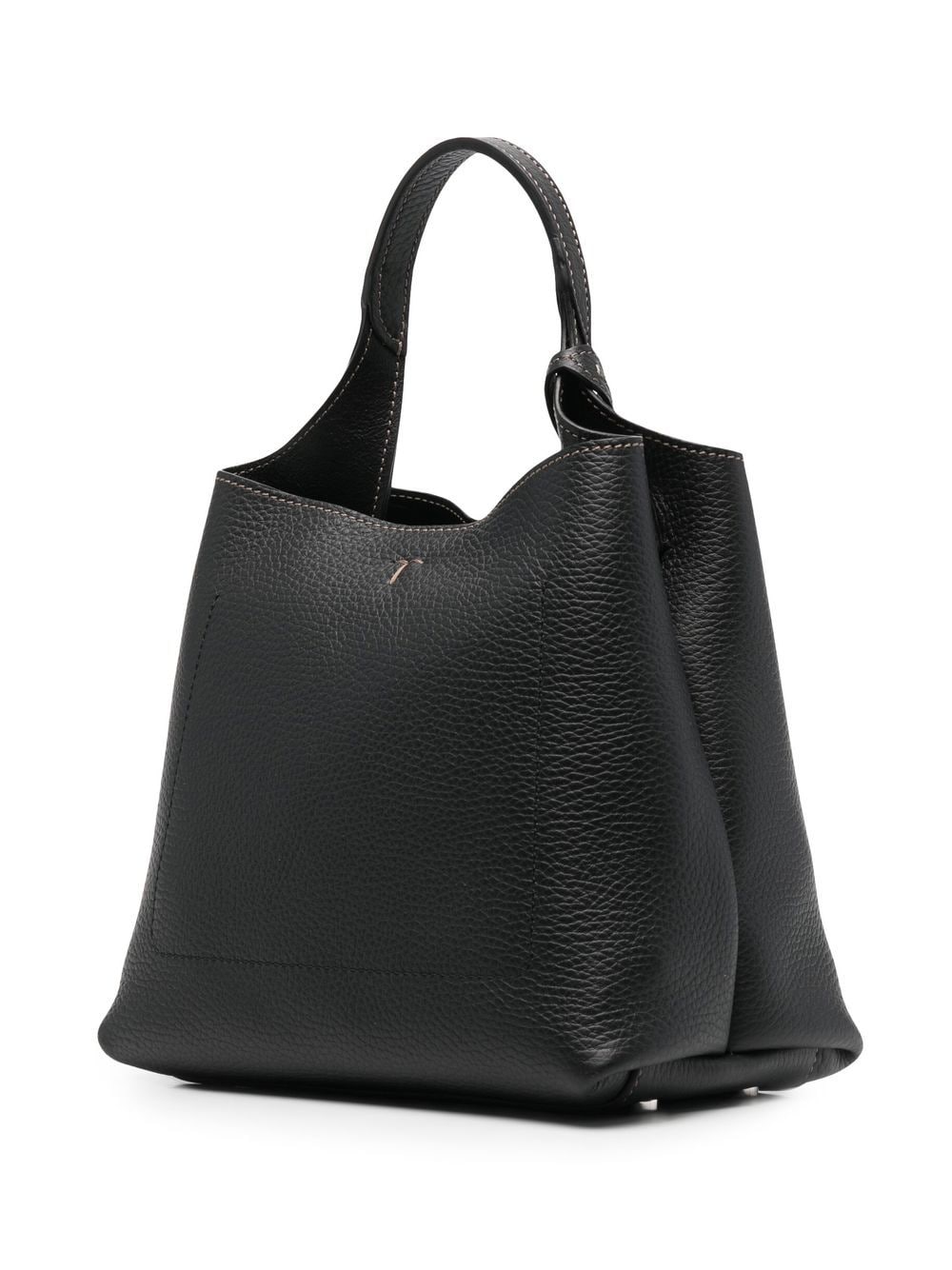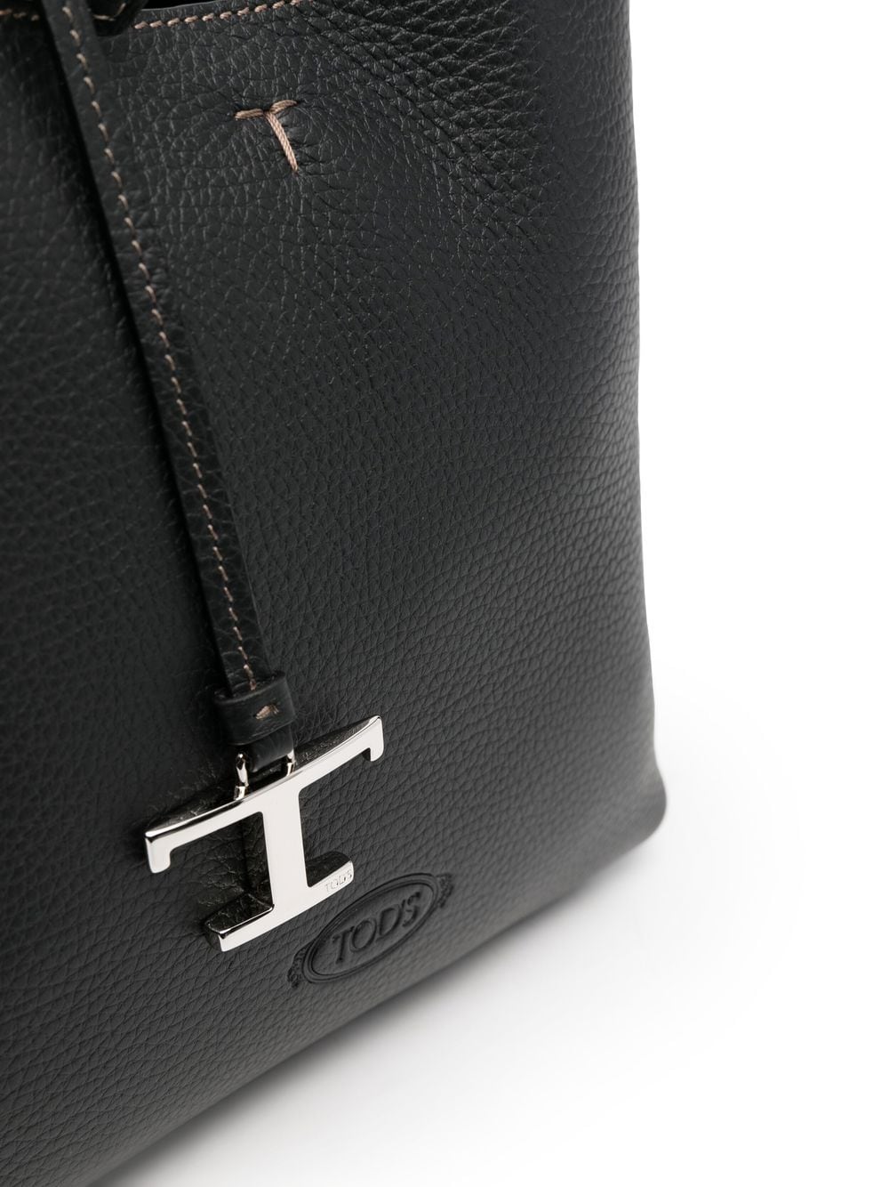 Tijdloze lederen draagtas van Tod 'S Met zwart, kalfsleer, zilvertoon logo-plaque, bovenste ritssluiting, enkele schouderband en enkele cirkelvormige bovenste handgreep.