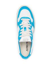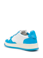 Medaillewinnaar low-top sneakers door Autry in witte, kobaltblauwe kalfsleer, paneelontwerp, geperforeerde teen, logo-patch op tong, logo geborduurd aan zijkant, merk binnenzool, ronde teen, kant-en-klare bevestiging en platte rubberen zool.