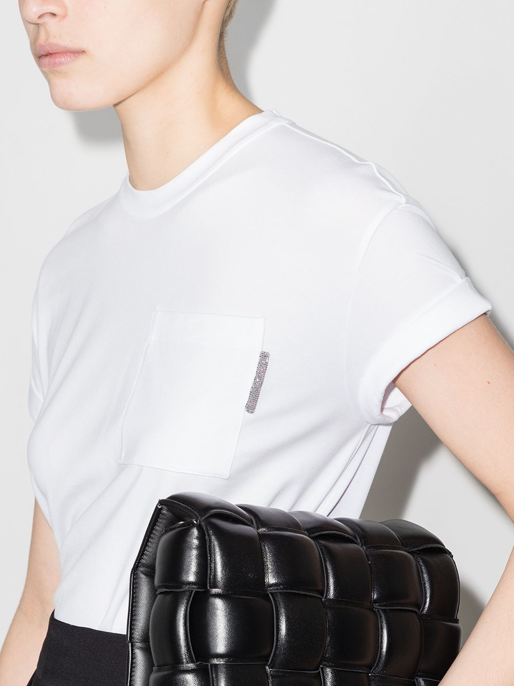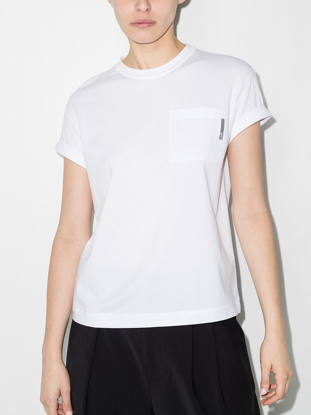 Wit katoenen Monili Crew-Neck katoenen T-shirt van Brunello Cucinelli met kenmerkende Monili-kettingdetail, bemanningslid, korte mouwen, borstvakpak en rechte zoom.