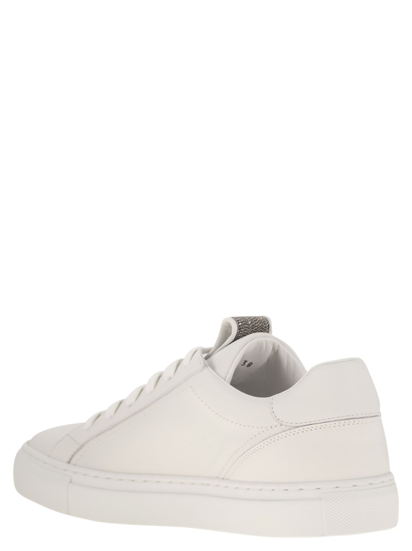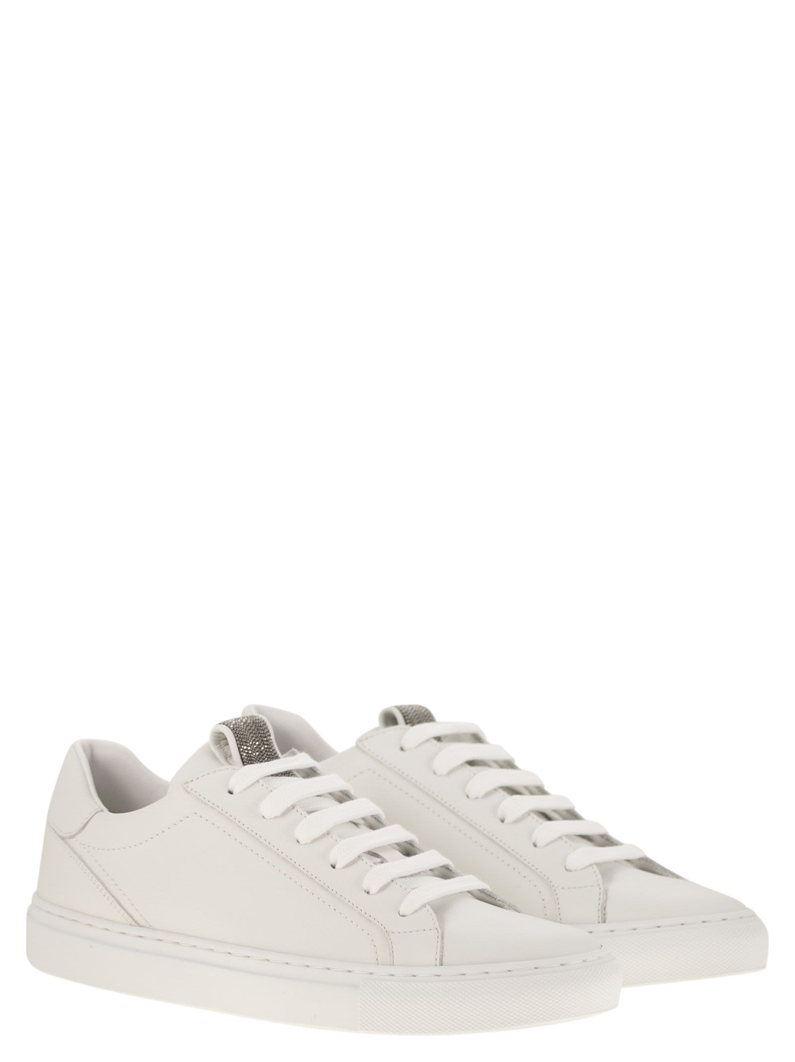 The sporty and essential allure of these matte calfskin sneakers is enriched by the iconic decoration of the Brunello Cucinelli collections. On the tongue stands out an insert entirely embroidered in thin rows of shiny monili for a refined luminous effect. - Flat fabric lace closure - Leather lining - TPU rubber sole - Nickel-free monili decoration DESIGNER ID: MZGSG2525 C7592