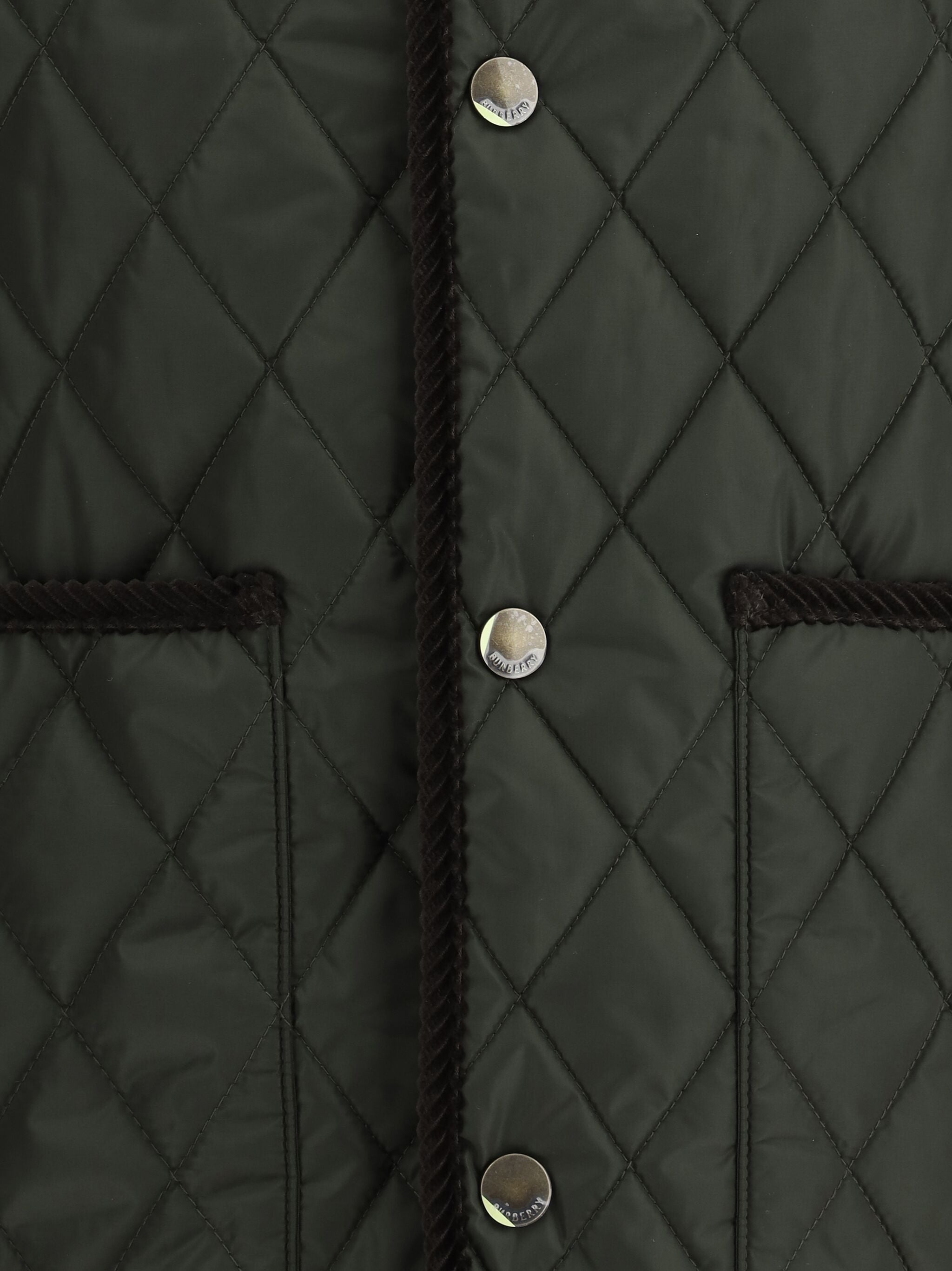Il gilet trapuntato Burberry in verde oliva è un capo versatile e pratico, perfetto per la stagione autunnale. La chiusura frontale con abbottonatura a pressione garantisce comfort, mentre le due tasche laterali applicate offrono funzionalità. Un design semplice ma elegante, ideale per ogni occasione casual.